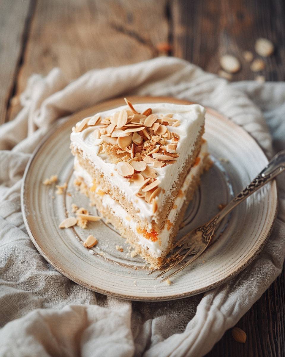 photography food styling, macro close-up shot: Almond Orange Cake on a wooden table, boho decoration, beige colors, morning lighting + shadows, kodak portra 400 --ar 4:5 --style raw --v 6.0