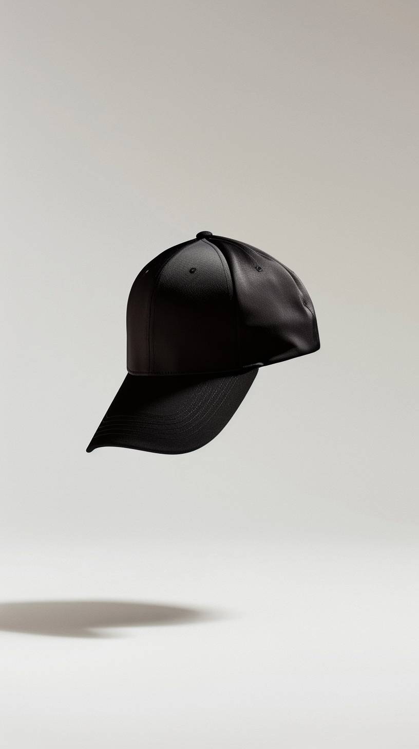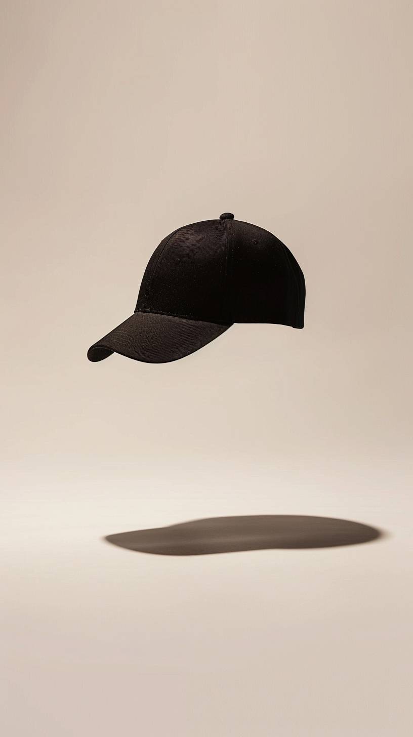 A black baseball cap floating in the air against a solid white background in a product photography shot with high resolution and precise details. The close-up shot has a centered composition with a top-down view and no shadows on an empty floor. A soft shadow effect is used with a minimalist white environment and simple clean background. The professional studio lighting and high-end retouching achieve a sharp focus and depth of field in the style of a magazine cover design with a minimalistic style and professional color grading. --ar 67:119 --v 6.0