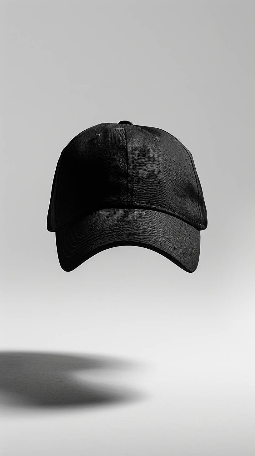 흰색 배경에 떠 있는 검정색 야구 모자. 고해상도로 세밀한 제품 사진 촬영이 이루어졌습니다. 클로즈업 촬영은 중앙 구성으로, 위에서 아래로 바라보는 시야에서 바닥에는 그림자가 없습니다. 부드러운 그림자 효과와 미니멀한 흰색 환경, 간단하고 깔끔한 배경이 사용되었습니다. 전문 스튜디오 조명과 고급 리터칭으로 뚜렷한 초점과 깊이감이 구현되었으며, 잡지 표지 디자인 스타일의 미니멀리즘과 전문적인 색 조정이 적용되었습니다.