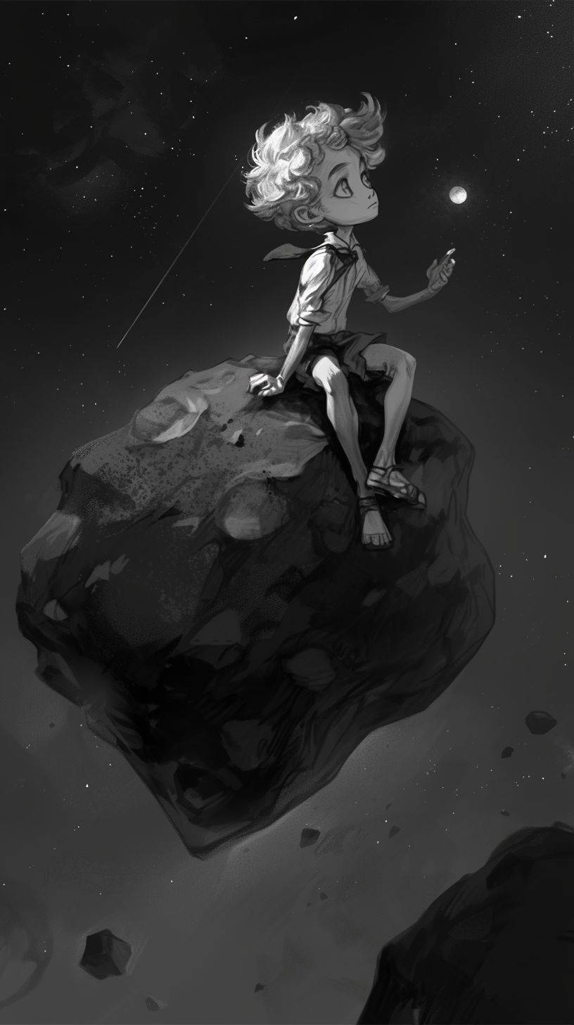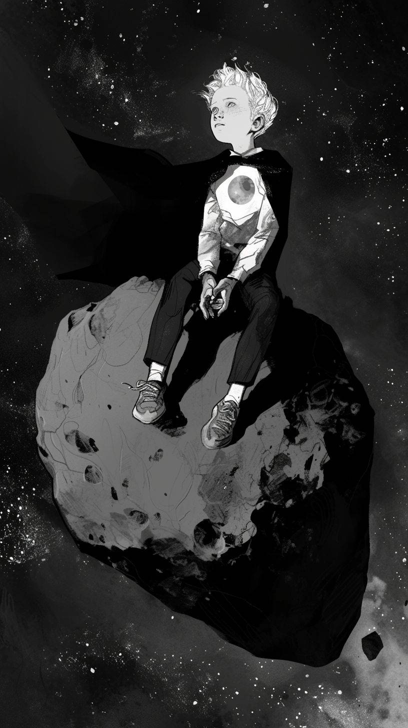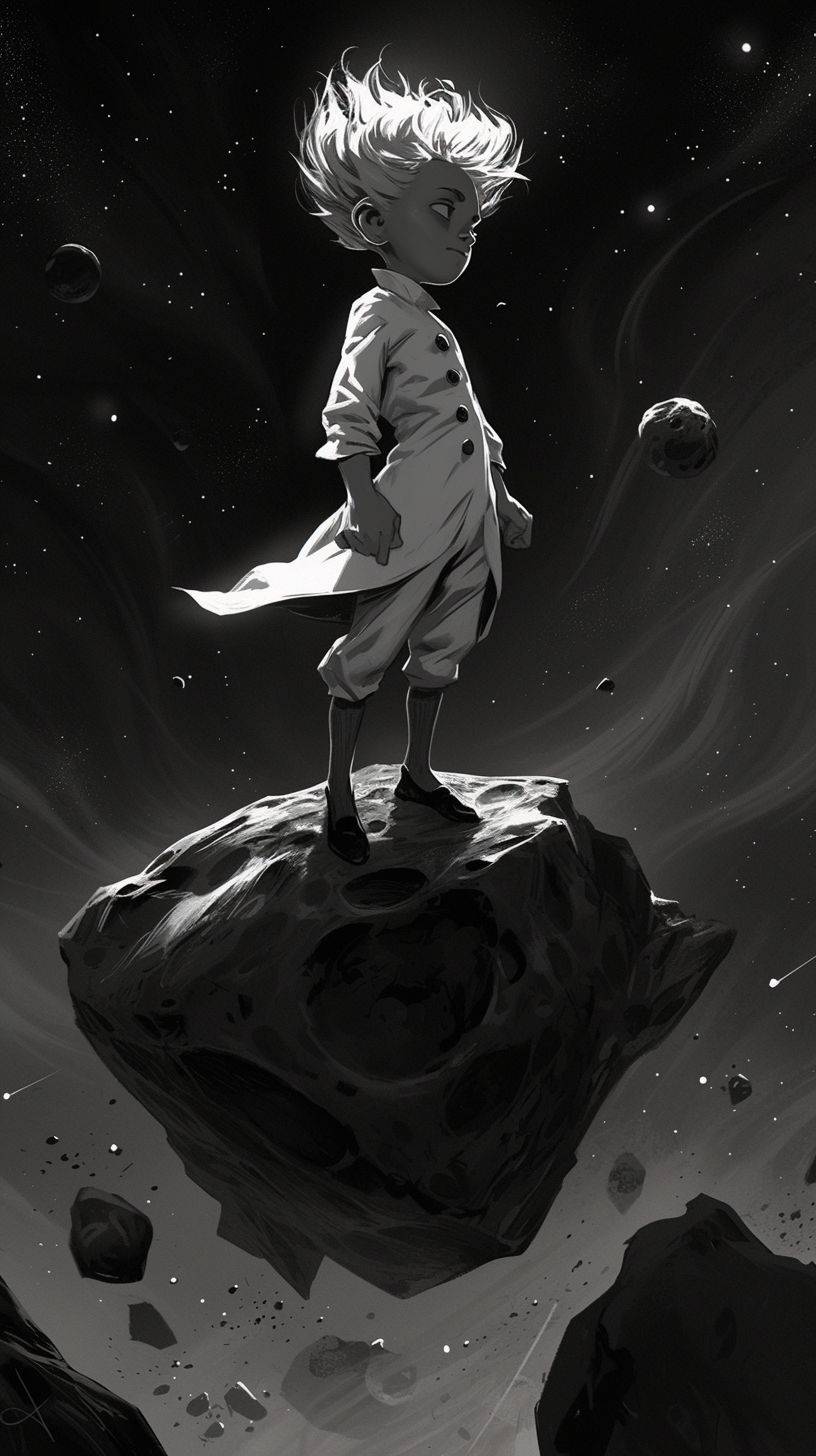 소행성에 있는 어린 왕자가 강렬한 시선과 섬세한 캐릭터 표현을 갖춘 흑백 스타일로 묘사되며, 기발한 형태와 순식간에 놓칠 수 있는 세부 사항이 있다.