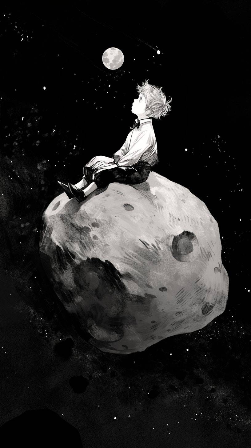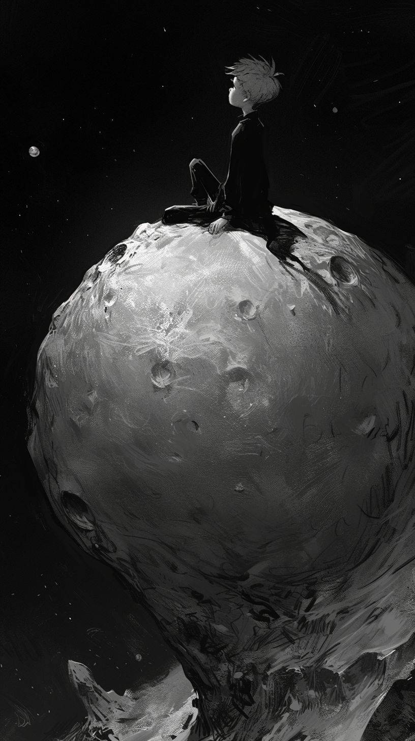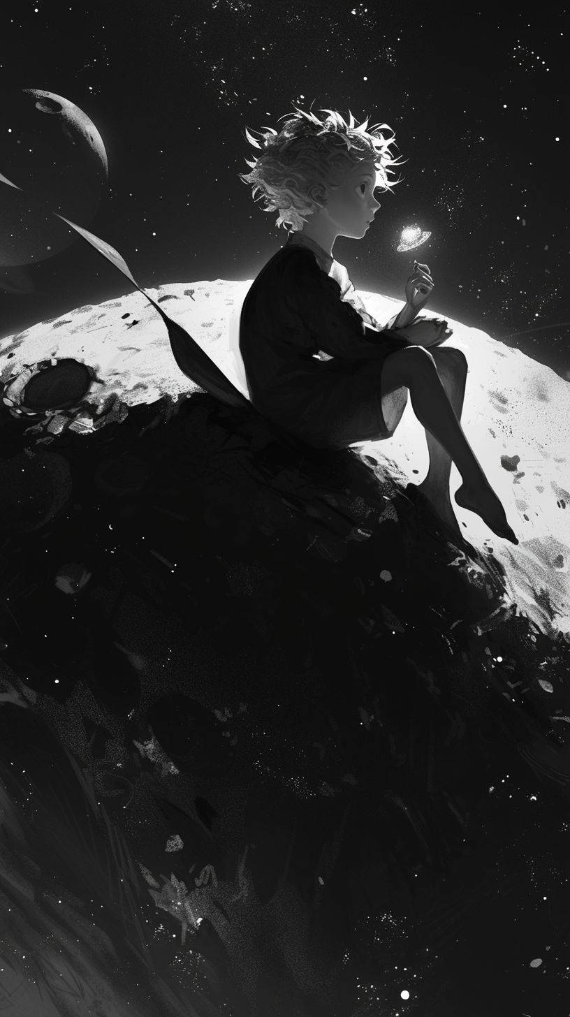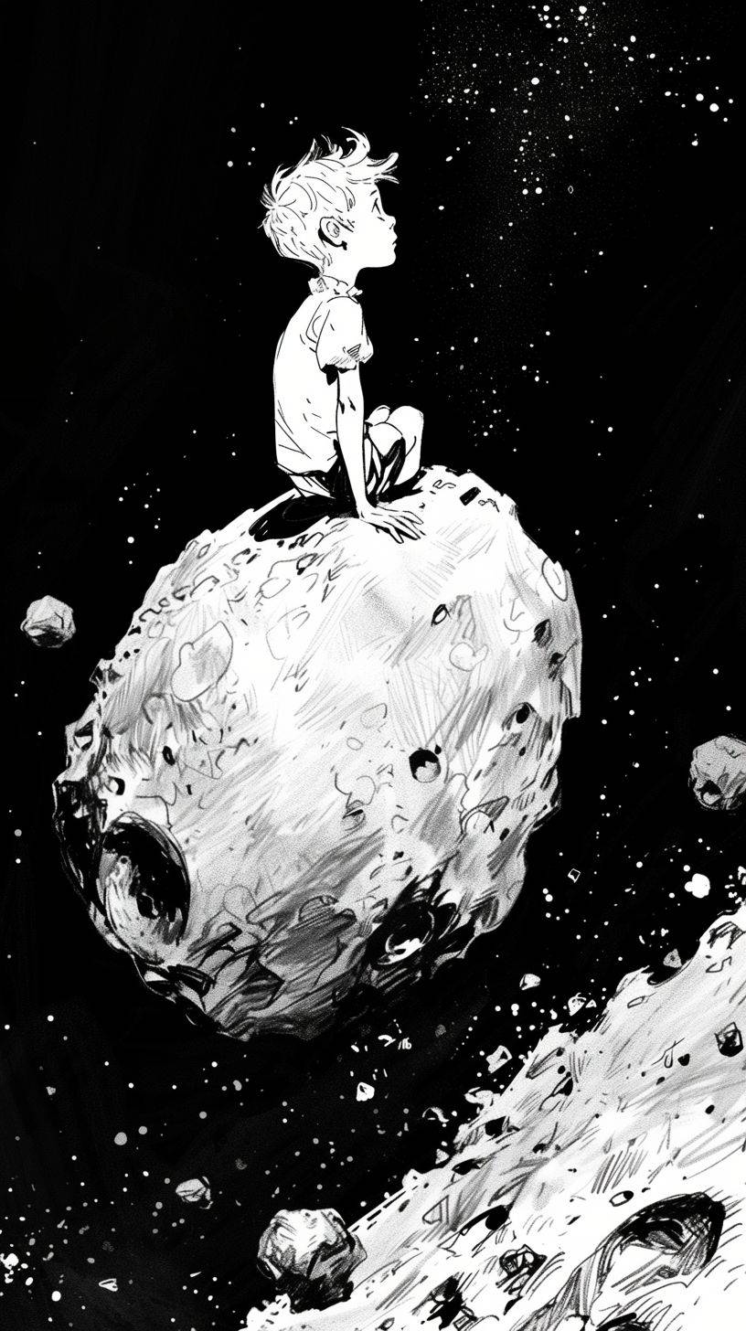 소행성에 있는 어린 왕자가 강렬한 시선과 섬세한 캐릭터 표현을 갖춘 흑백 스타일로 묘사되며, 기발한 형태와 순식간에 놓칠 수 있는 세부 사항이 있다.