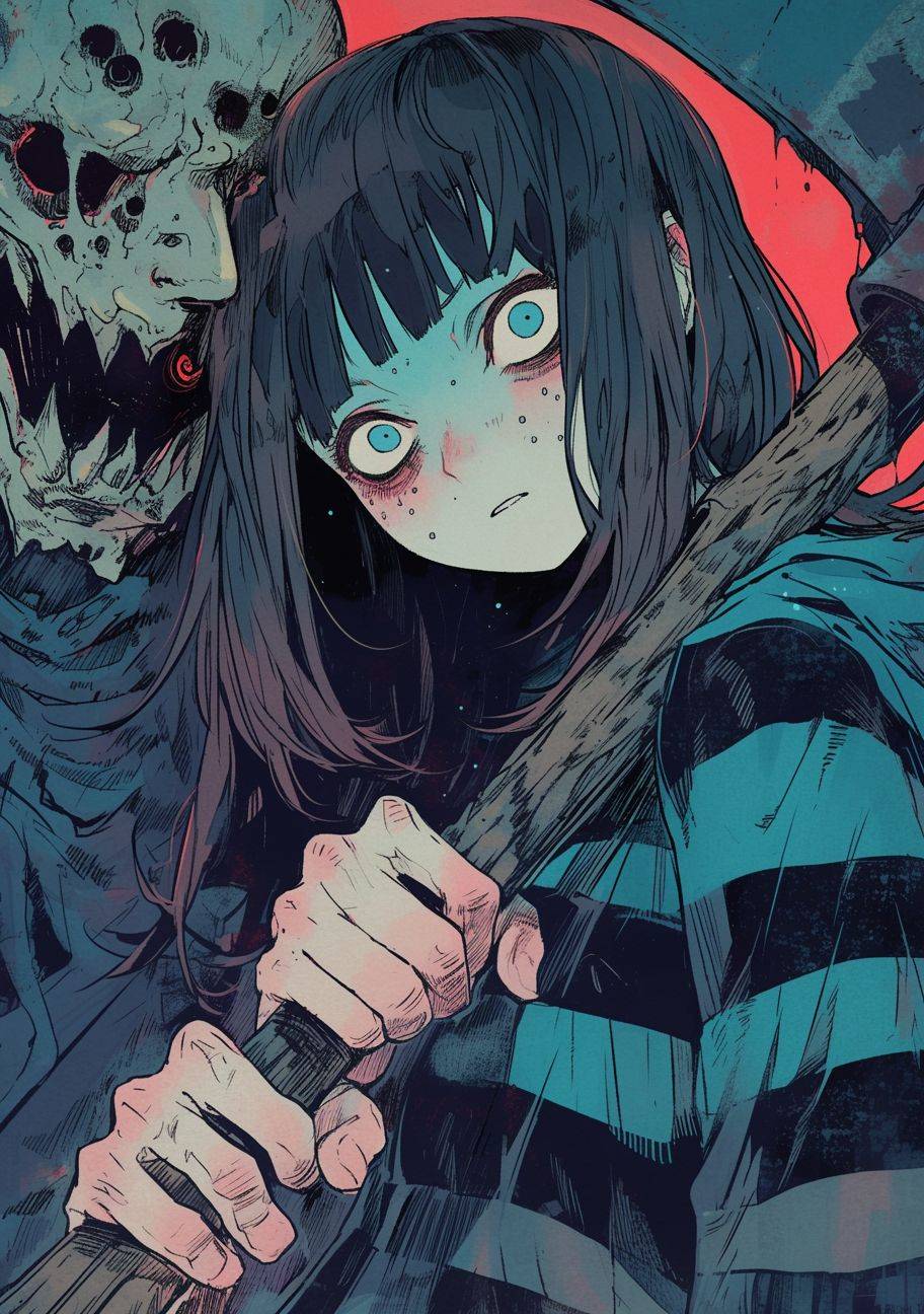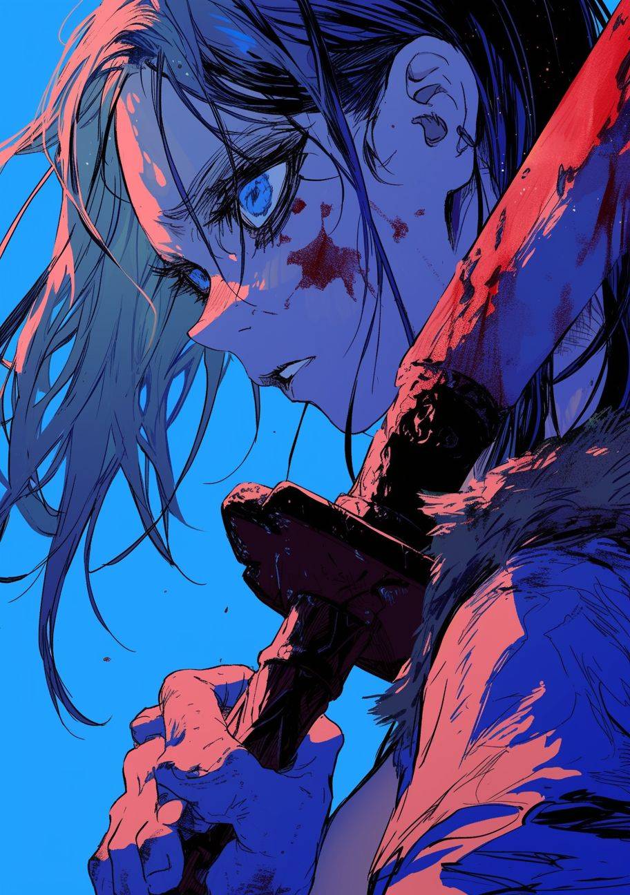 파란 캐릭터 옆에 무기를 들고 있는 소녀가 있으며, 연한 청록과 어두운 크림슨 스타일의 만화 아트로, 엣지가 있는 다층적 의미를 가지고 있습니다.