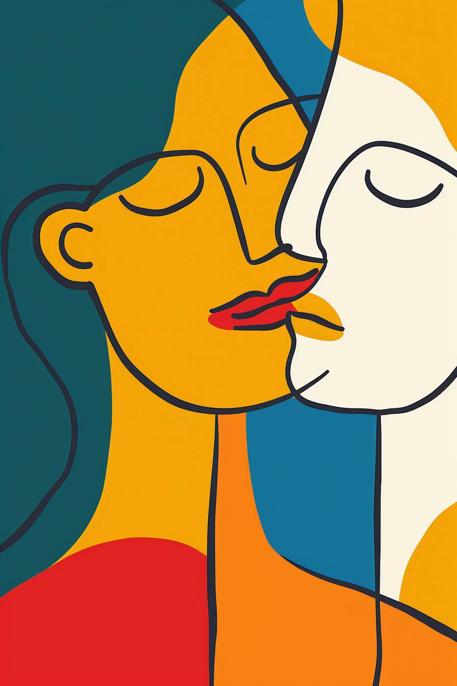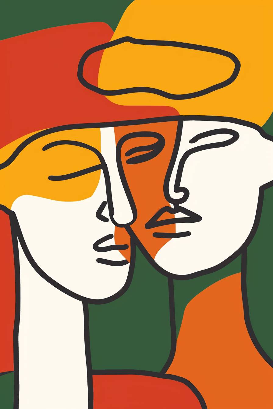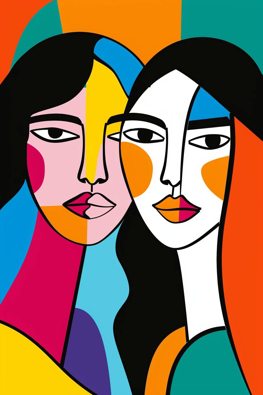 우정의 날에서 영감을 받은 만화 친구들, 인스타그램 로고의 오른쪽 상단 모서리에 쓰여진, 피카소가 마티스 스타일로 그린, 간단한 선 그림, 평면 일러스트레이션, 밝은 색상, 선과 강한 색 블록, 머리에서 가슴까지의 클로즈업 샷, 추상 미술, 평면 디자인, 낙서 아트.