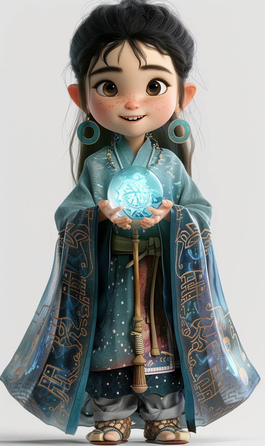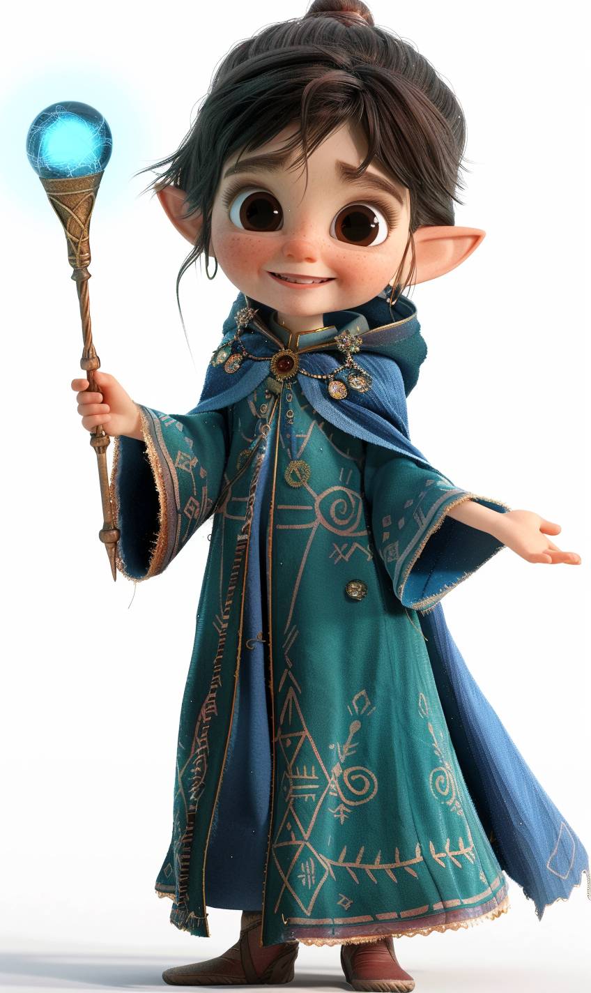 정교한 마법 견습생 로브를 입은 작은 소녀가 호기심과 지혜로 빛나는 눈을 가지고 있으며, 고대 룬이 새겨진 작은 마법 지팡이를 단단히 두 손으로 감싸고 있다. 그 지팡이의 맨 위에는 부드럽고 신비로운 파란색 빛을 발산하는 수정 구슬이 있으며, 흰색 배경 앞에 서서 행복하게 큰 입을 벌리고 웃고 있다.