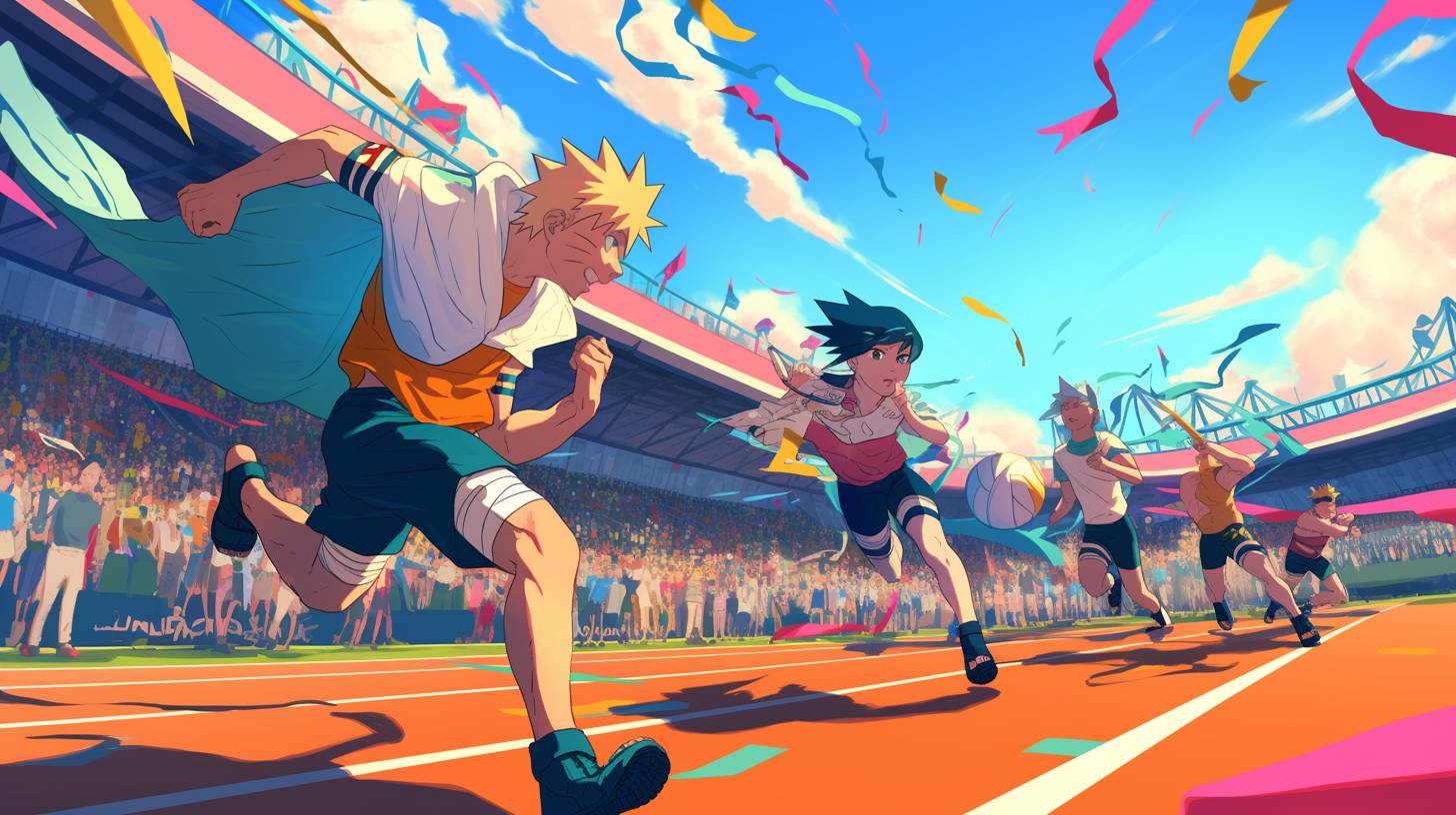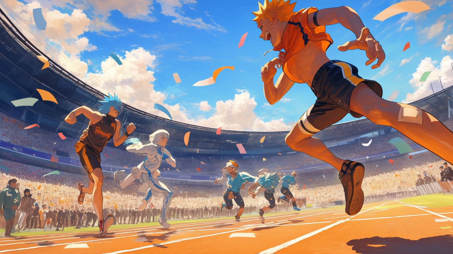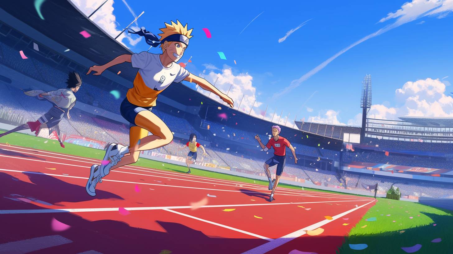 올림픽 경기장에 설정된 100m 스프린트 경기 장면, 나루토가 출연하며, 경쟁의 흥분과 긴박감을 포착하고, 스타일은 역동적인 포즈, 생동감 있는 액션, 세밀한 캐릭터 디자인에 초점을 맞추고 있습니다.