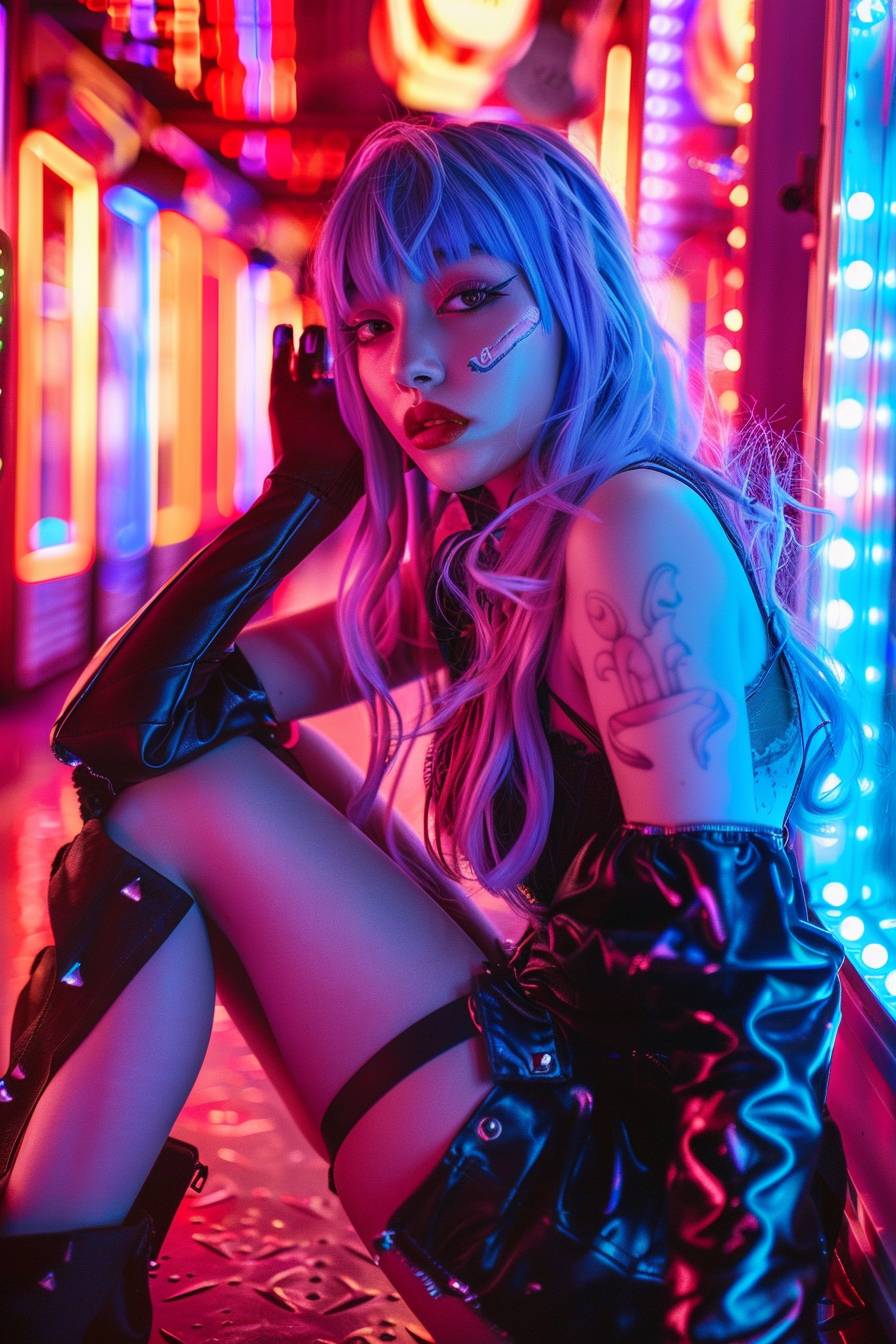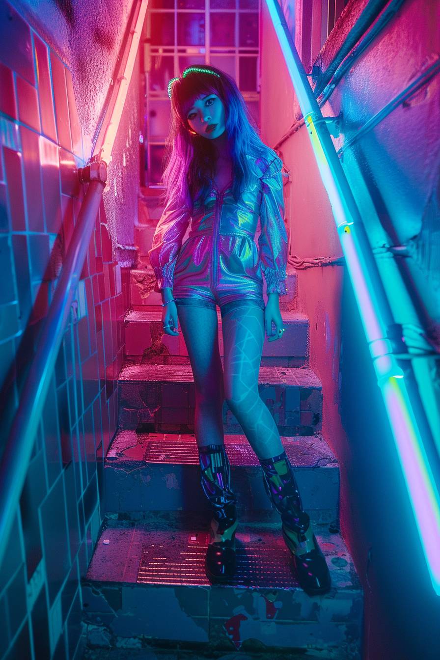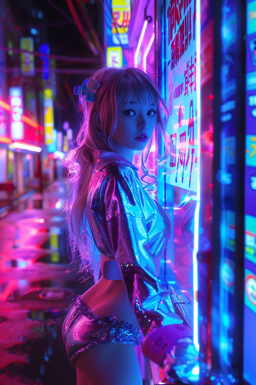 고해상도 전신 사진과 스타일리시한 사이키델릭을 특징으로 한 아름다운 카와이 애니메이션 소녀. 영화적인 빛나는 네온 색상 그레이딩과 다채로운 조명을 활용하여 이 이미지는 아직 전개되지 않은 이야기의 매력적인 캐릭터로 그녀를 묘사해야 합니다.
