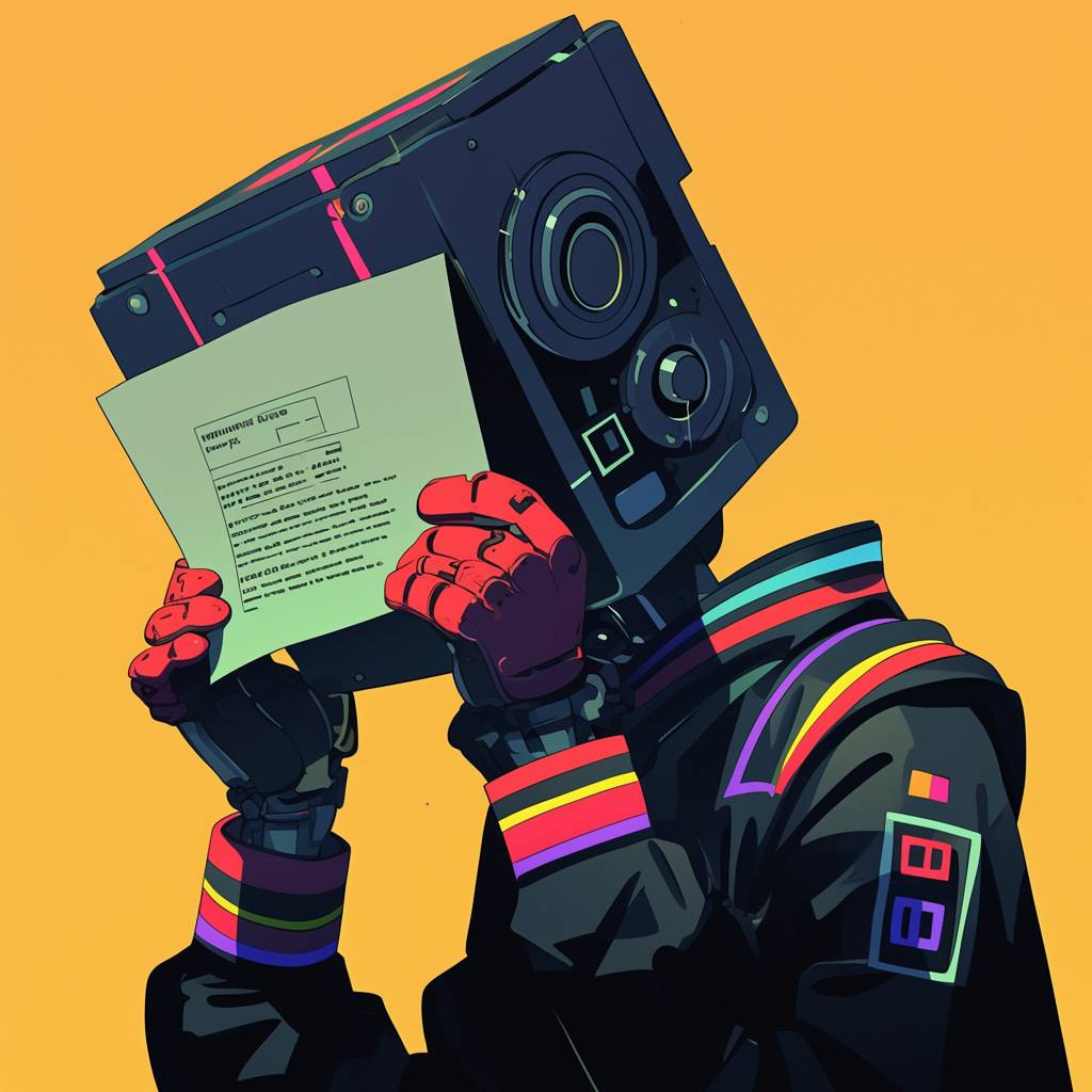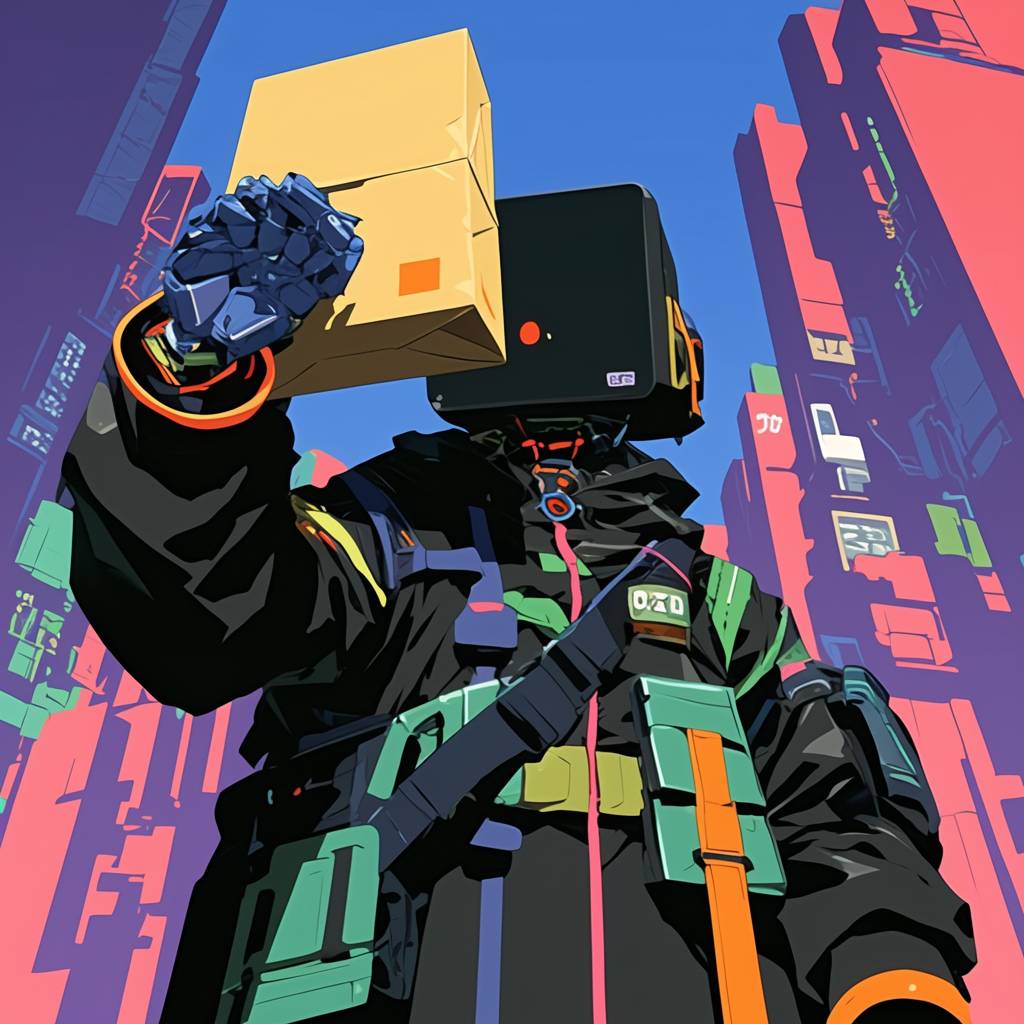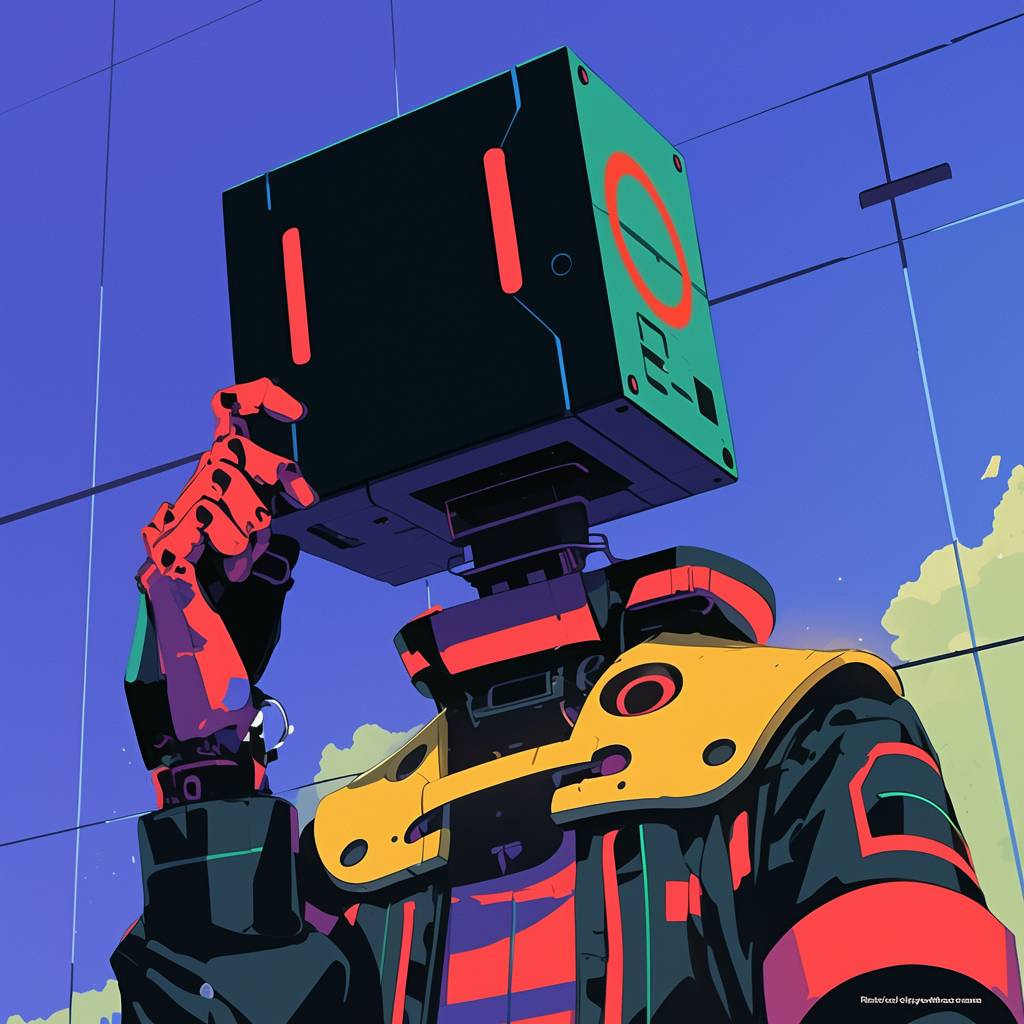 기계 팔을 가진 로봇이 머리에 정사각형 종이 가방을 들고 있다
