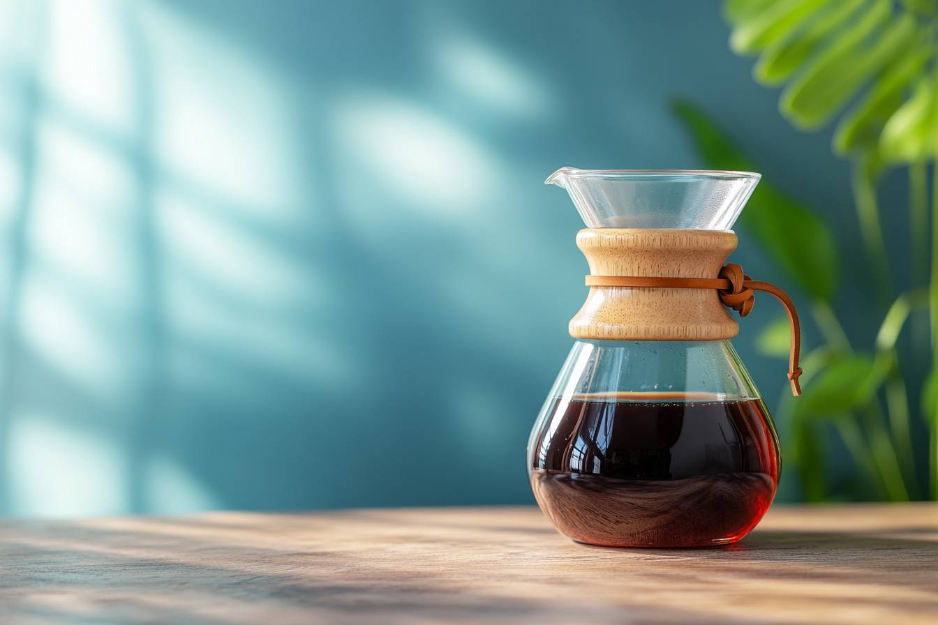 제품 사진, 아름다운 이미지, 단순 궁극적 스타일 커피 메이커 디자인, 현대적인 클래식 디자인, 나무 테이블 배경, 제품 관점, 아이cy 블루