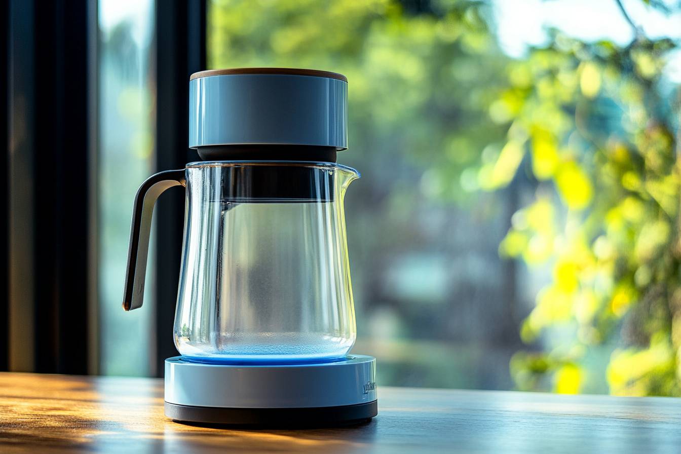 Product photography beauty picture , Simple ultimate style coffee maker design, Modern classic design , wooden table background , Product perspective , icy blue --ar 3:2 --style raw --v 6.1