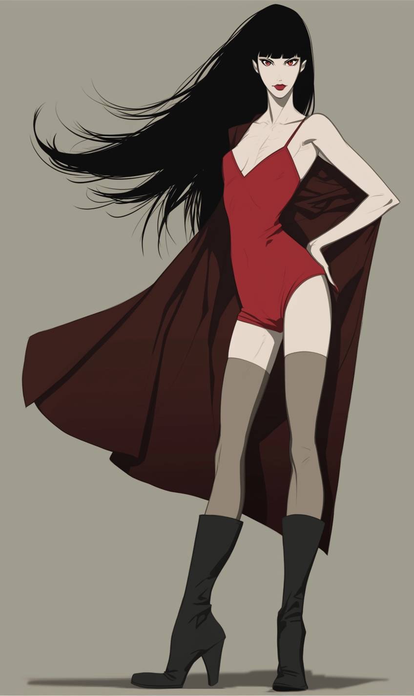 간단한 드로잉의 뱀파이렐라, 앨리 브로쉬 스타일로 단순한 선, 평면 색상 및 막대 인물, 미니멀한 배경으로.