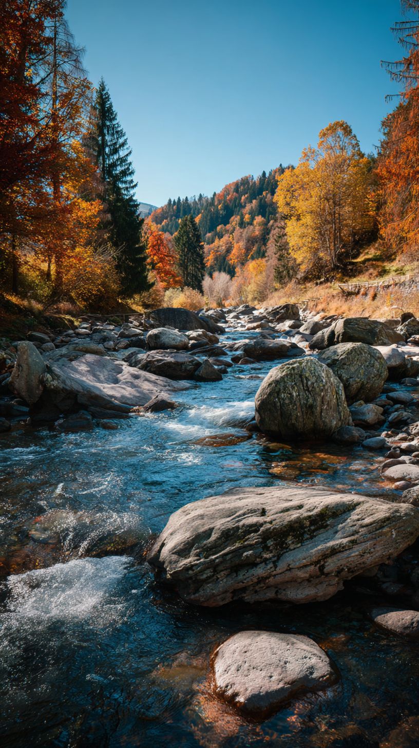가을 산 계곡의 초현실적인 사진으로, 투명한 물이 자연적으로 흩어진 큰 돌들 사이를 강하게 흐르고 있습니다. 고르지 않은 바위 패턴, 밝은 햇살이 수면을 비추고, 양쪽에는 빨간색, 주황색, 노란색의 생생한 가을 잎이 있으며, 넓은 푸른 하늘, 깊이 있는 깊이감, 자연의 숲 분위기, 매우 세밀한 DSLR 사진입니다.