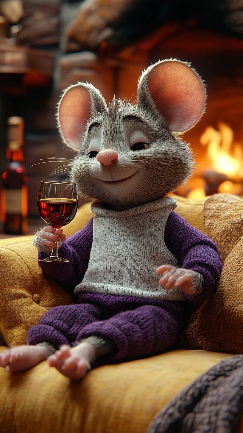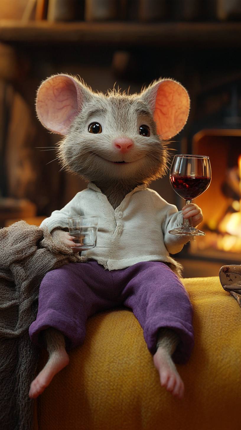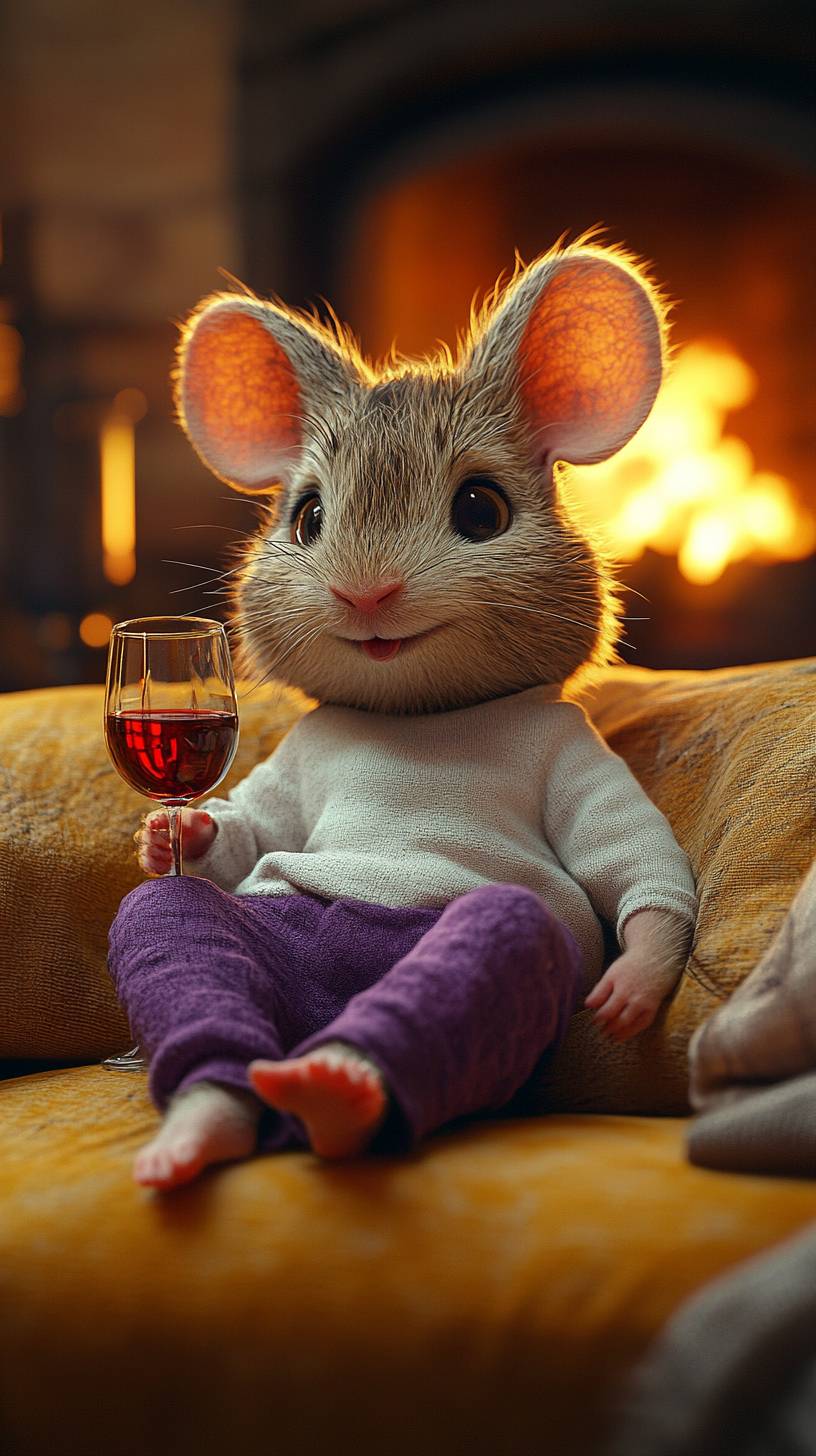 A funny mouse wearing purple pants and a white t-shirt, laying on the couch with a glass of wine, enjoying and relaxing, couch is yellow, in the living room in a wood cabin, soft lighting, fire place, shot by ARRI Alexa LF camera with ARRI Signature Primes lens 12mm T1.8, 4K, cinematic, cartoonish, The scene captures a whimsical mouse, its tiny frame comfortably stretched out on a bright yellow couch, a glass of red wine delicately held in one paw, The living room, nestled in a cozy wood cabin, exudes warmth with a softly glowing fireplace casting gentle, flickering light, The mouse, clad in playful purple pants and a crisp white t-shirt, radiates relaxation and contentment, The cabin's rustic wooden walls and furniture add a touch of hominess, the scene is shot with the ARRI Alexa LF camera, the lens capturing every detail with stunning clarity and a cinematic touch, The overall ambiance is serene and inviting, a perfect blend of whimsy and comfort, The soft lighting enhances the cozy, laid-back atmosphere, while the cartoonish style adds a lighthearted and charming quality to the image, The detailed textures of the mouse’s outfit and the intricate patterns of the wood grain create a visually rich and engaging scene --ar 9:16 --stylize 750 --v 6.1