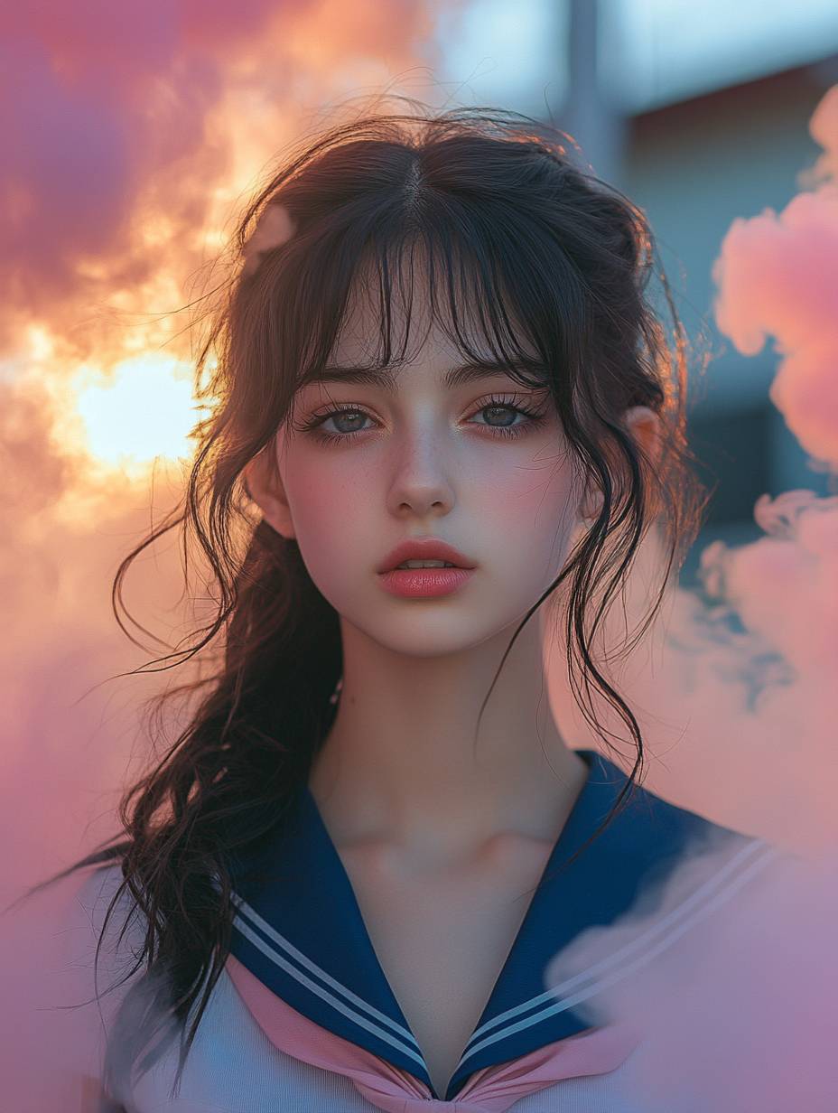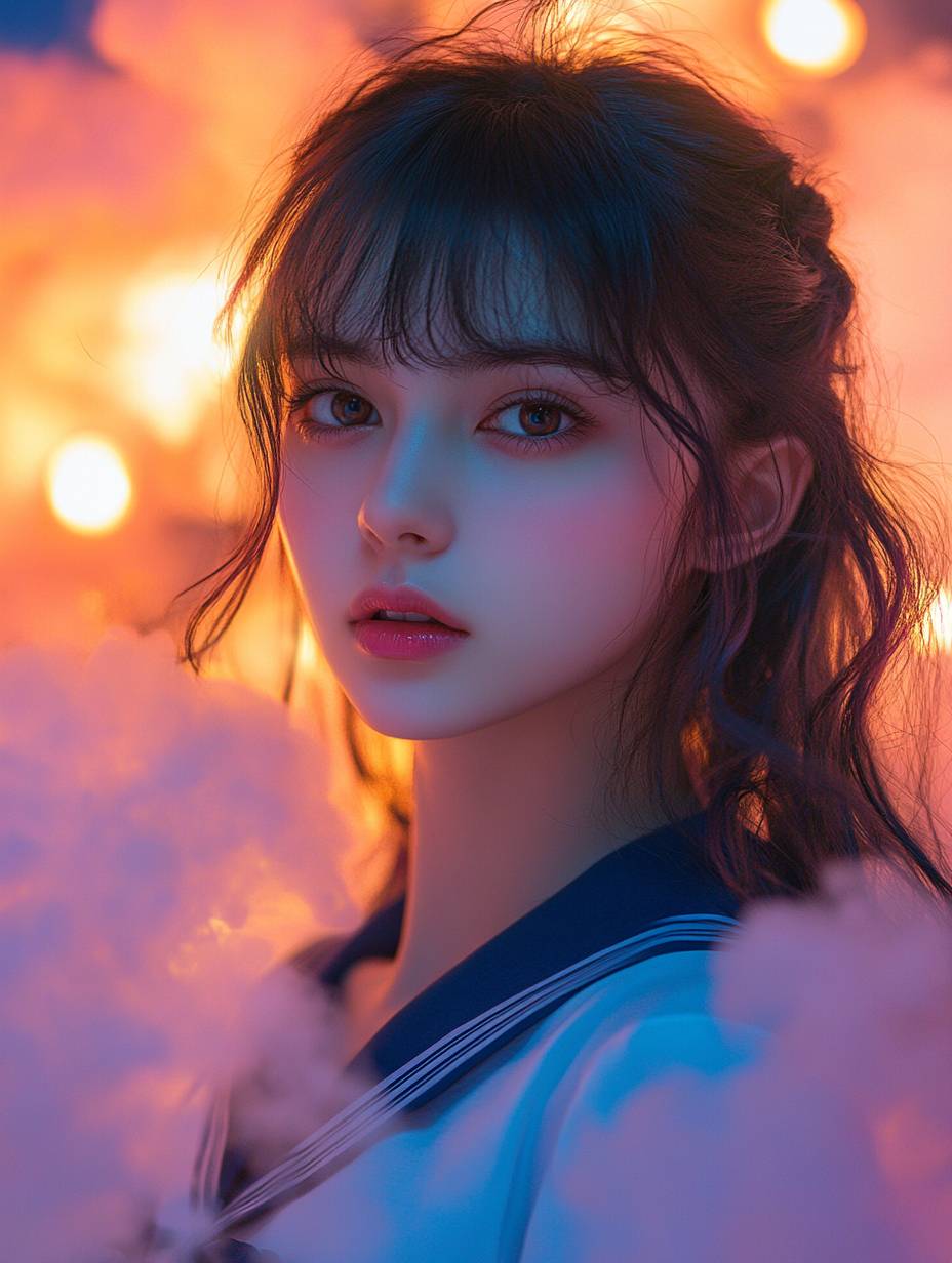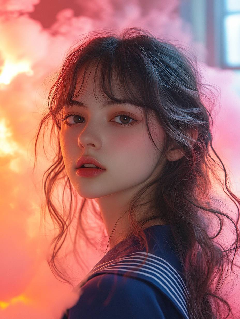 앞머리와 긴 머리를 가진 세일러복을 입은 고등학교 여학생의 인물 사진. 그녀는 카메라를 바라보고 있으며, 주변에는 형형색색의 형광 연기가 감싸고 있고, 부드러운 조명 스타일, 꿈 같은 분위기, 분홍색 톤, 매력적인 표정이 담겨 있습니다.