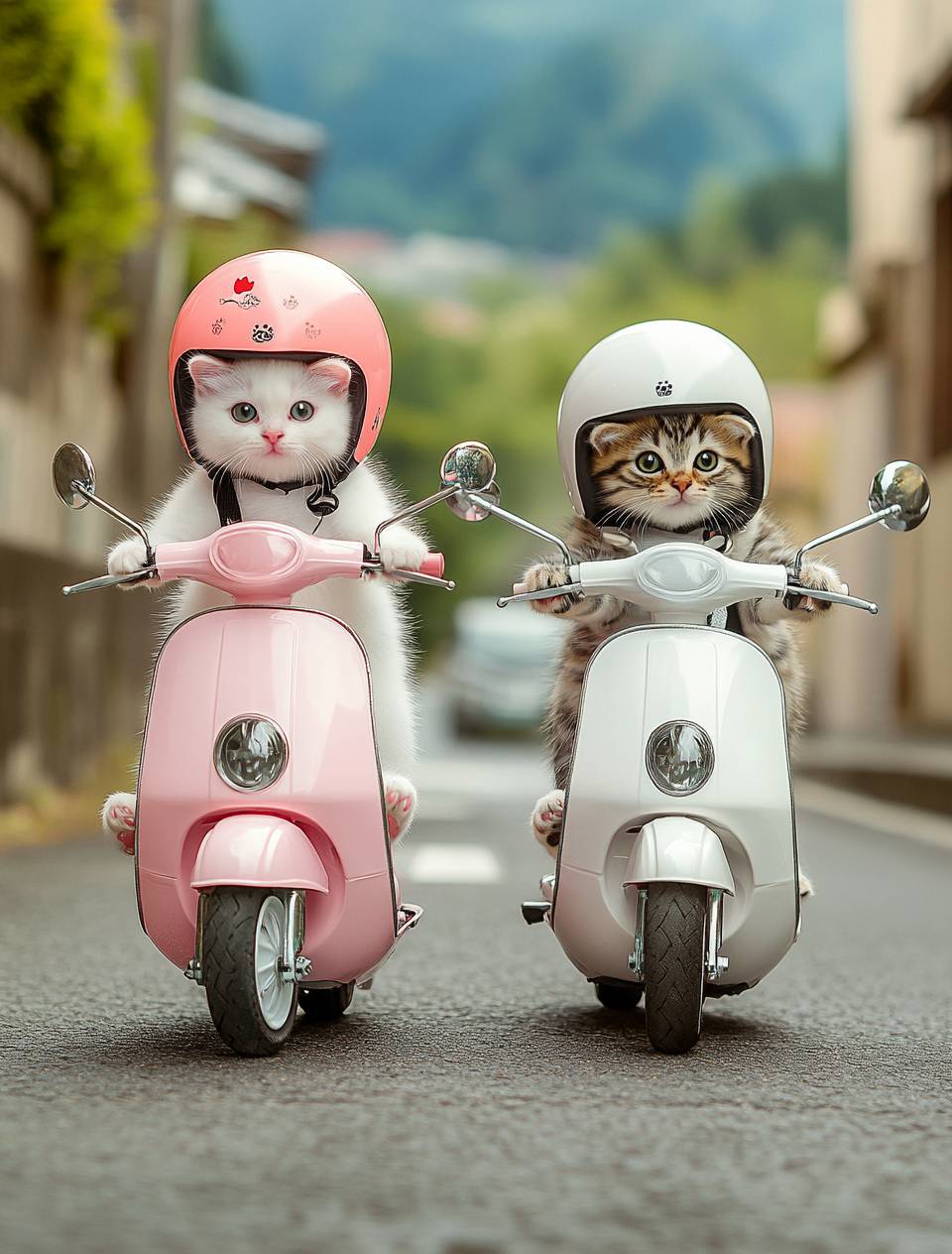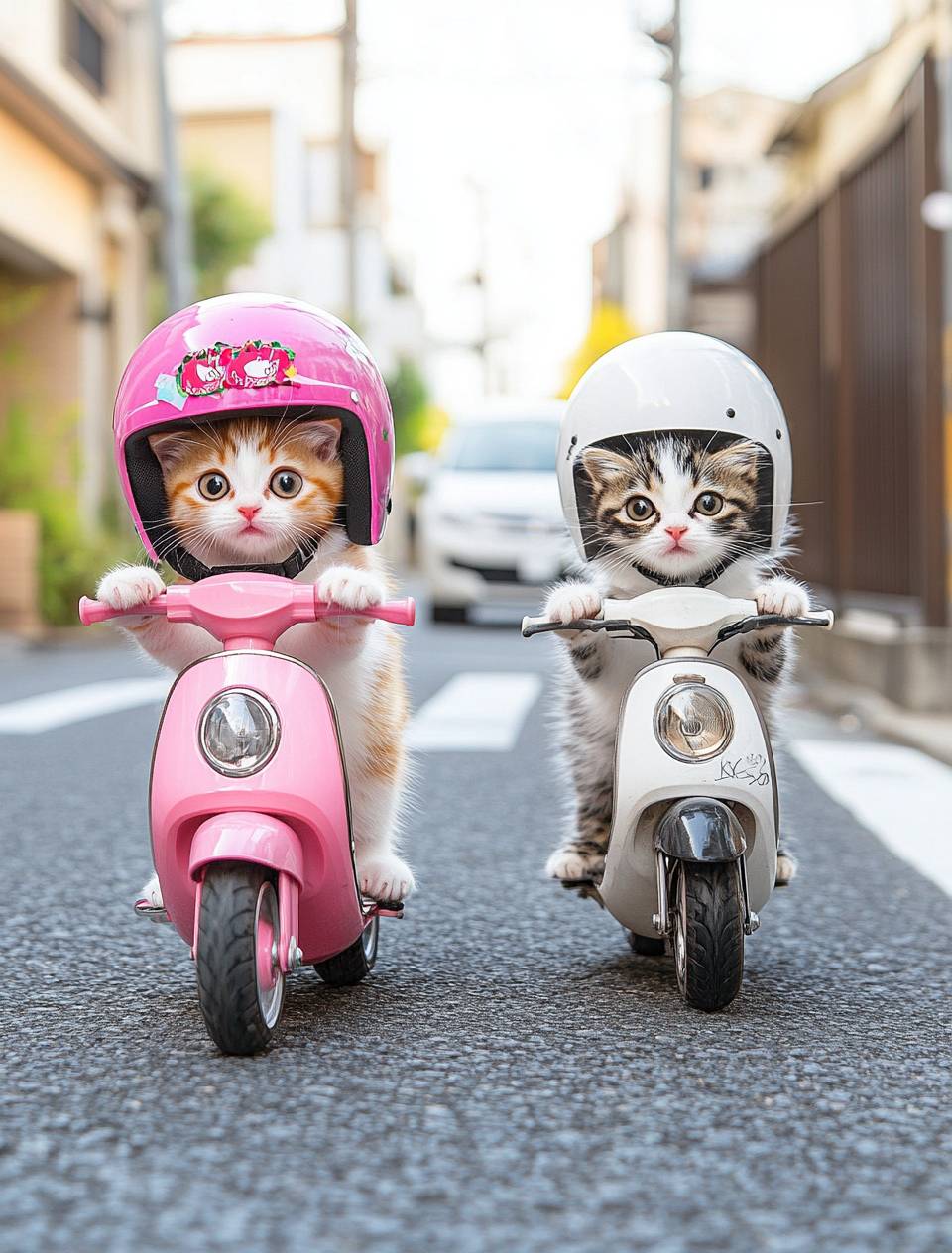 두 마리의 귀여운 새끼 고양이가, 하나는 핑크 헬멧과 핑크 스쿠터를 착용하고, 다른 하나는 흰 헬멧을 쓴 전기 스쿠터를 타고 있습니다.