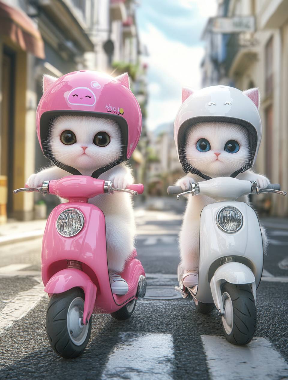 두 마리의 귀여운 새끼 고양이, 하나는 헬로 키티 핑크 헬멧과 핑크 스쿠터를 쓰고 있고, 다른 하나는 흰색 헬멧을 쓰고 전기 꼬리가 달린 스쿠터를 타고 거리에서 운전하고 있습니다. 귀엽고 사진 같은 스타일의 고해상도 사진.