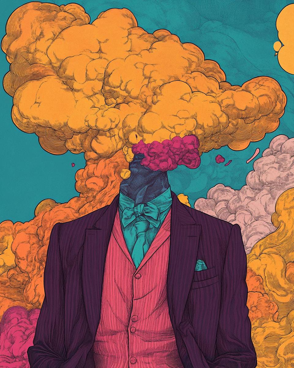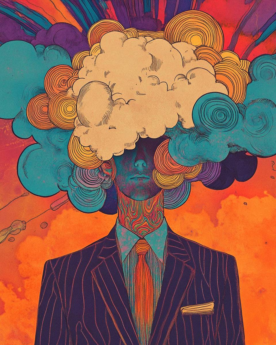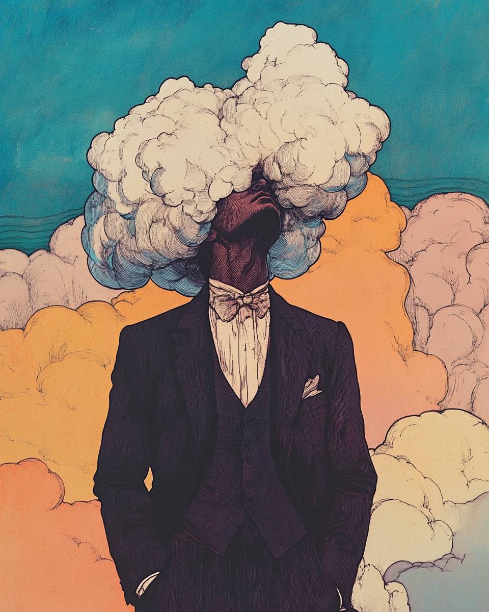 정장 차림의 남자가 구름 속에 머리를 담고 있는 아르 누보 일러스트, 생생한 색상.