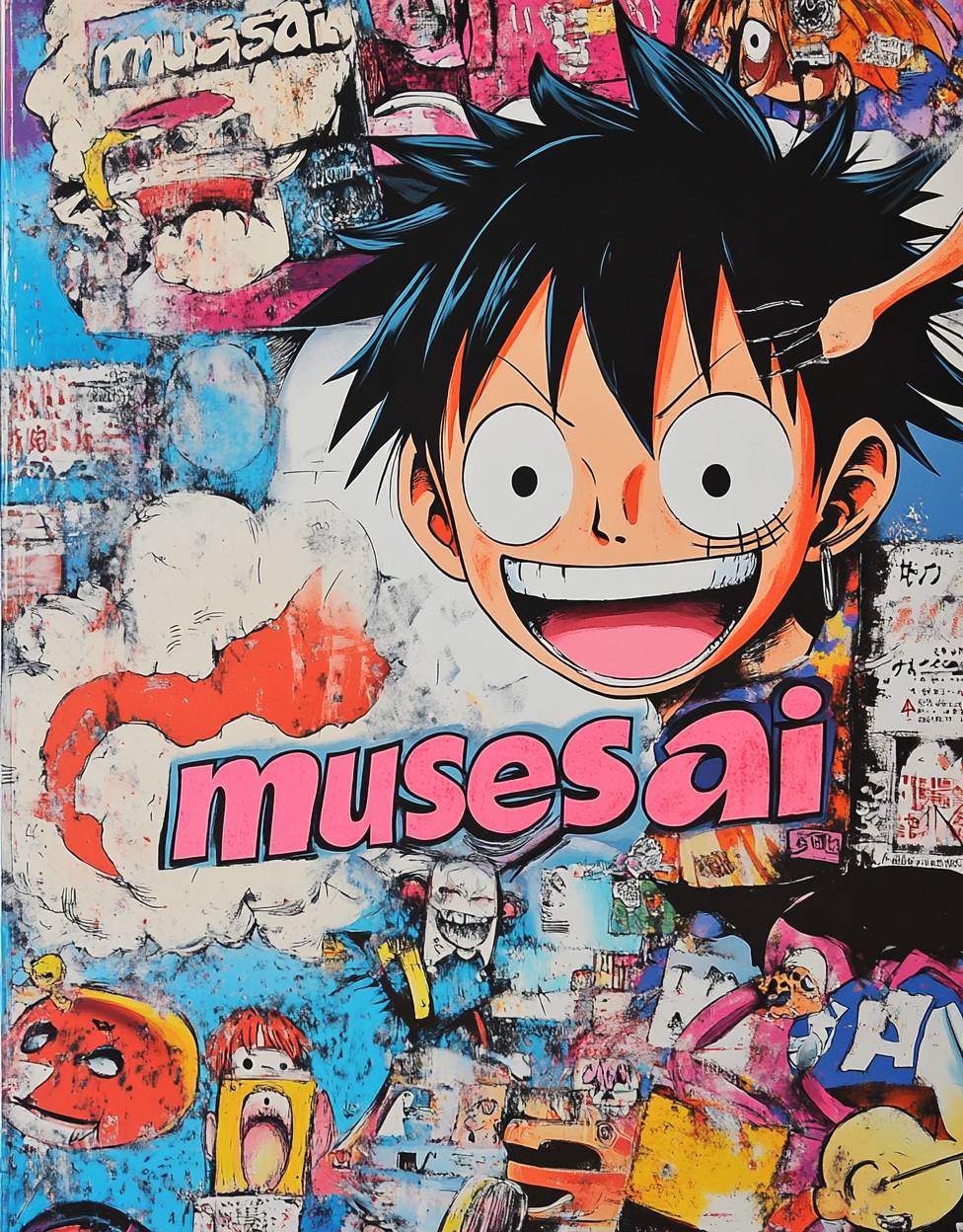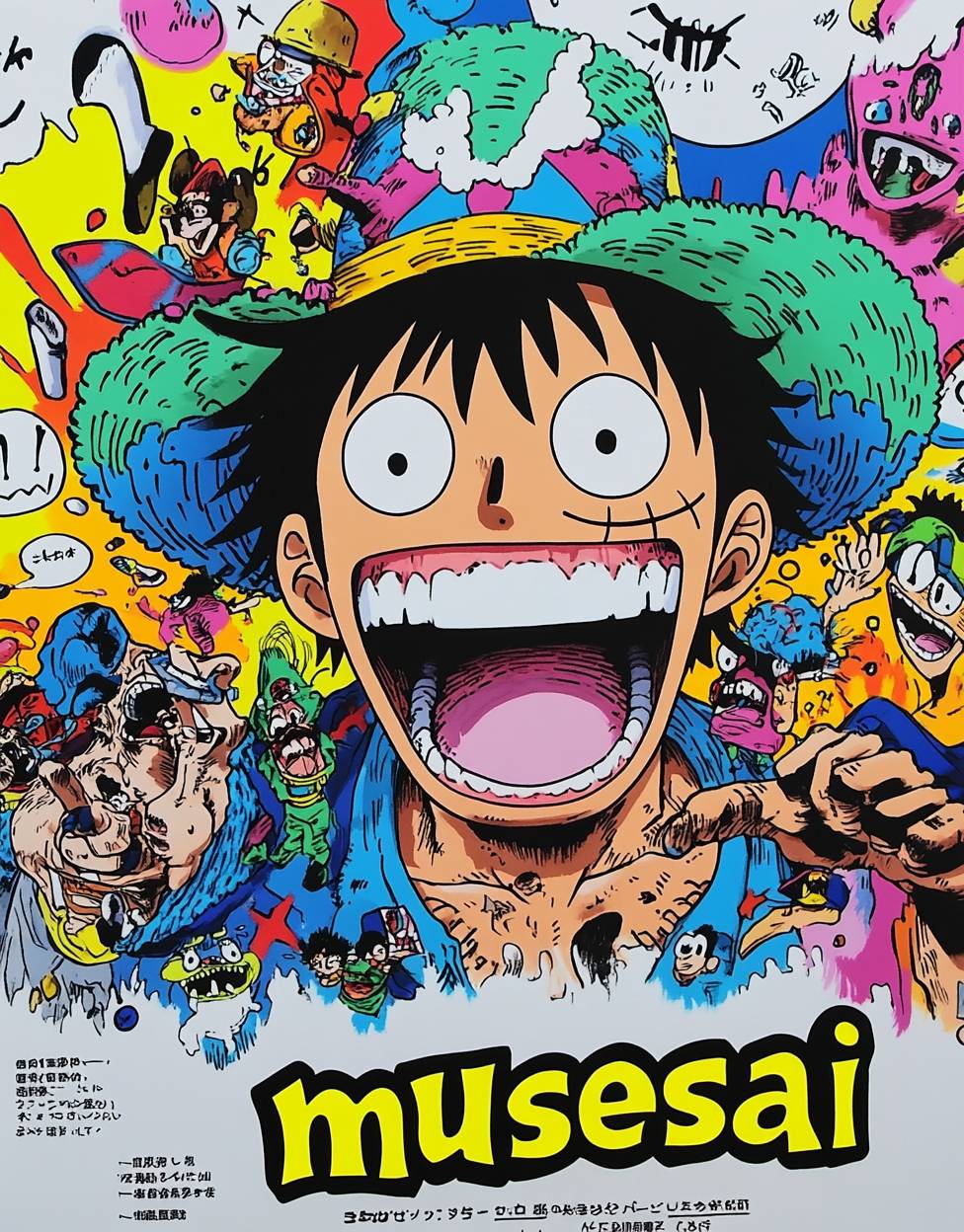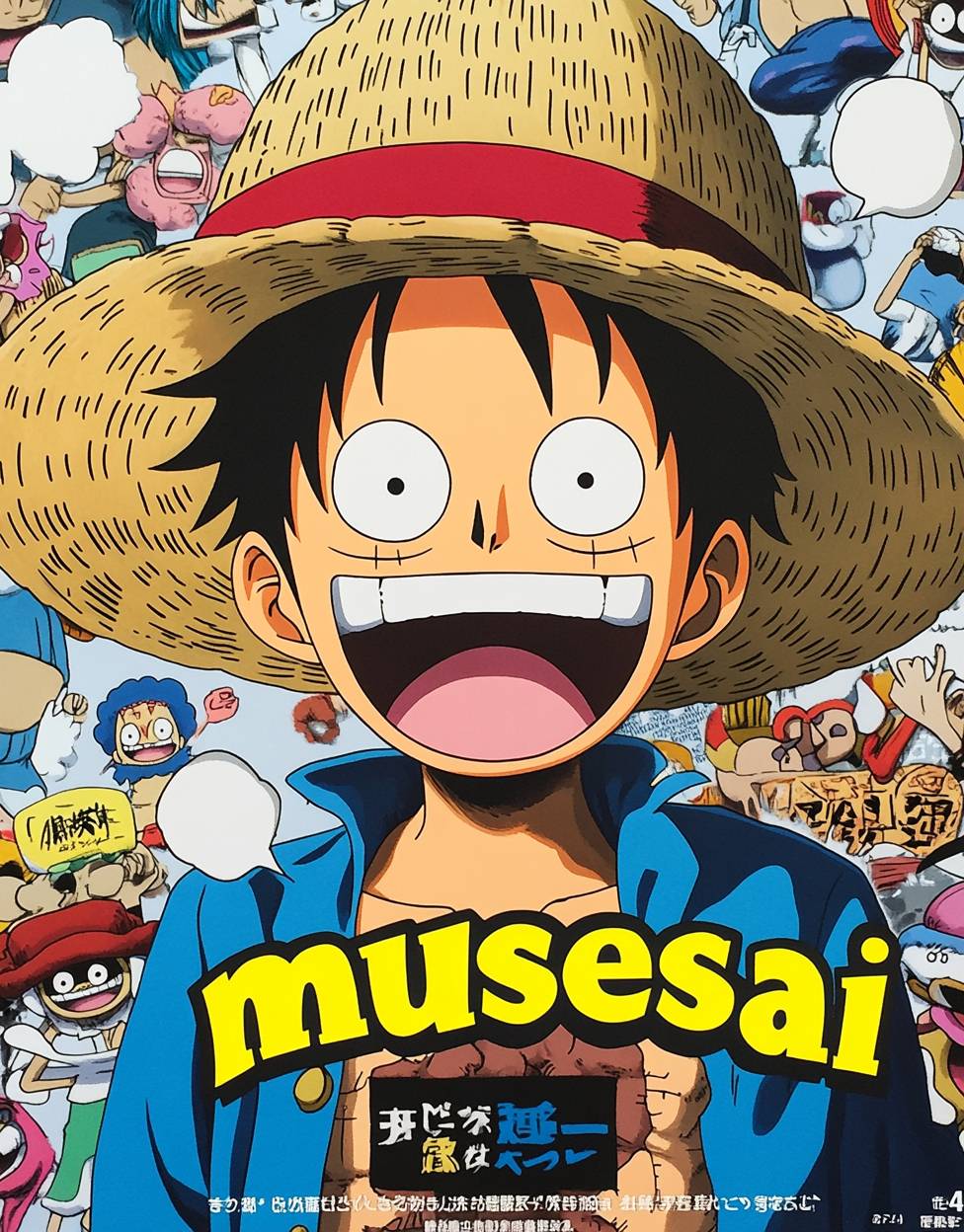 A colorful Japanese comic book style poster with the words "musesai" written in bold letters, featuring ONE PIECE, Japanese manga and anime series character ,The background is a white wall with black text detailing times of event details. In different panels there's speech bubbles containing funny expressions such as laughing or winking. A large panel at bottom shows time details for october 4th, five o'clock,2017 in small font. --ar 25:32 --v 6.1