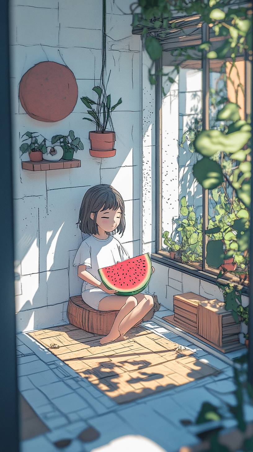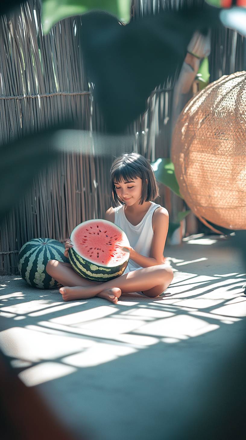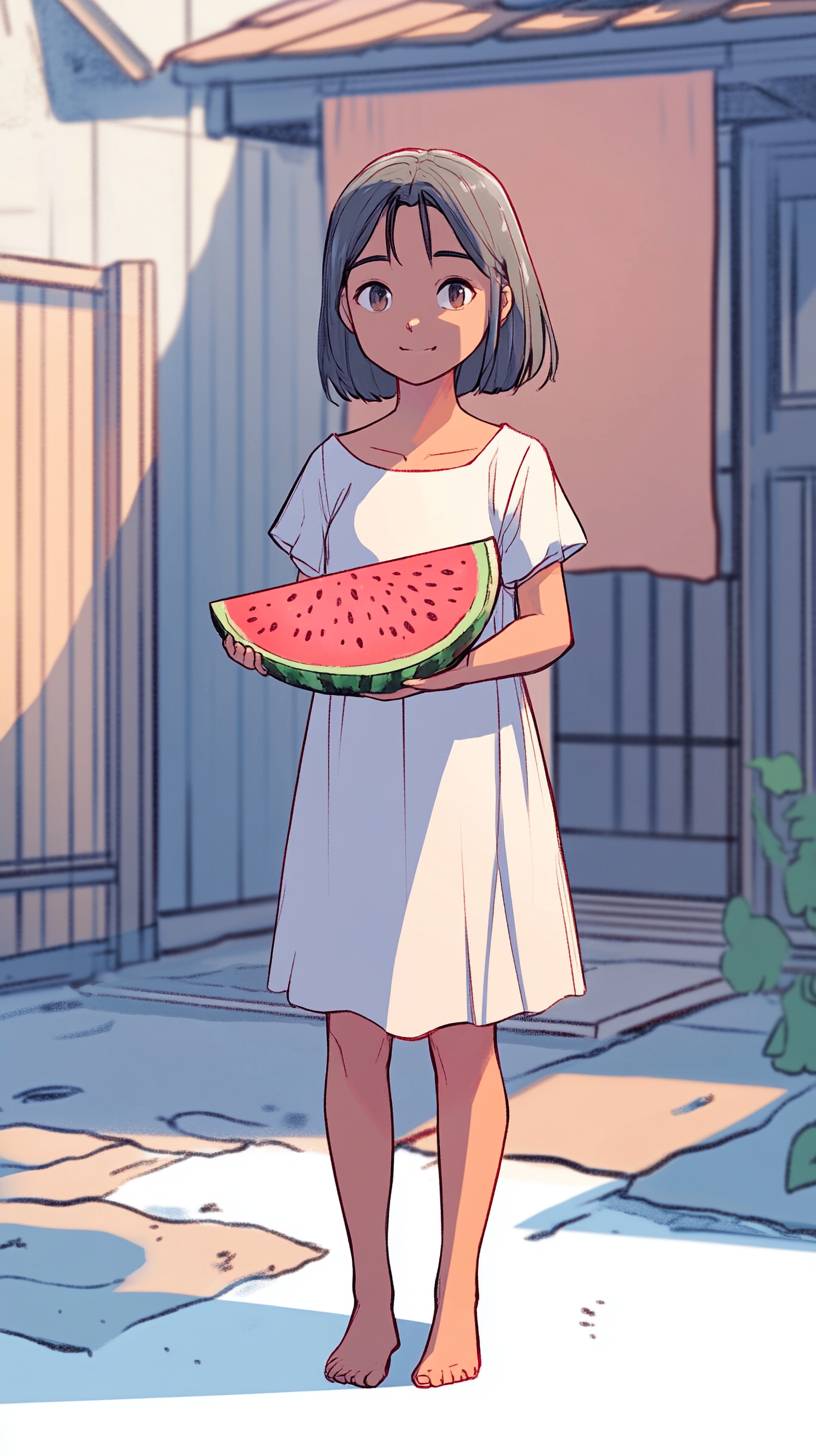 여름날 수박을 들고 있는 짧은 머리 소녀, 전통 집