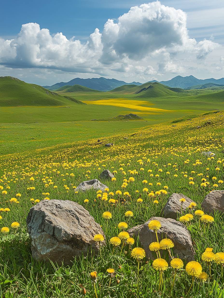 봄이 되면, 캉브룩 산 경치 좋은 지역에는 끝없는 초원이 있으며, 그 위에는 노란 민들레가 만개하고, 초록색 풀들이 어디에나 있습니다. 눈앞에는 작은 돌들이 흩어져 있습니다. 먼 곳에서는 흰 구름 아래에 구불구불한 산들이 보입니다. 이렇게 아름다운 장면은 나는 날아올라 그 아름다움을 경험하고 싶게 만듭니다. 사진은 이 장면을 고화질로 포착합니다.