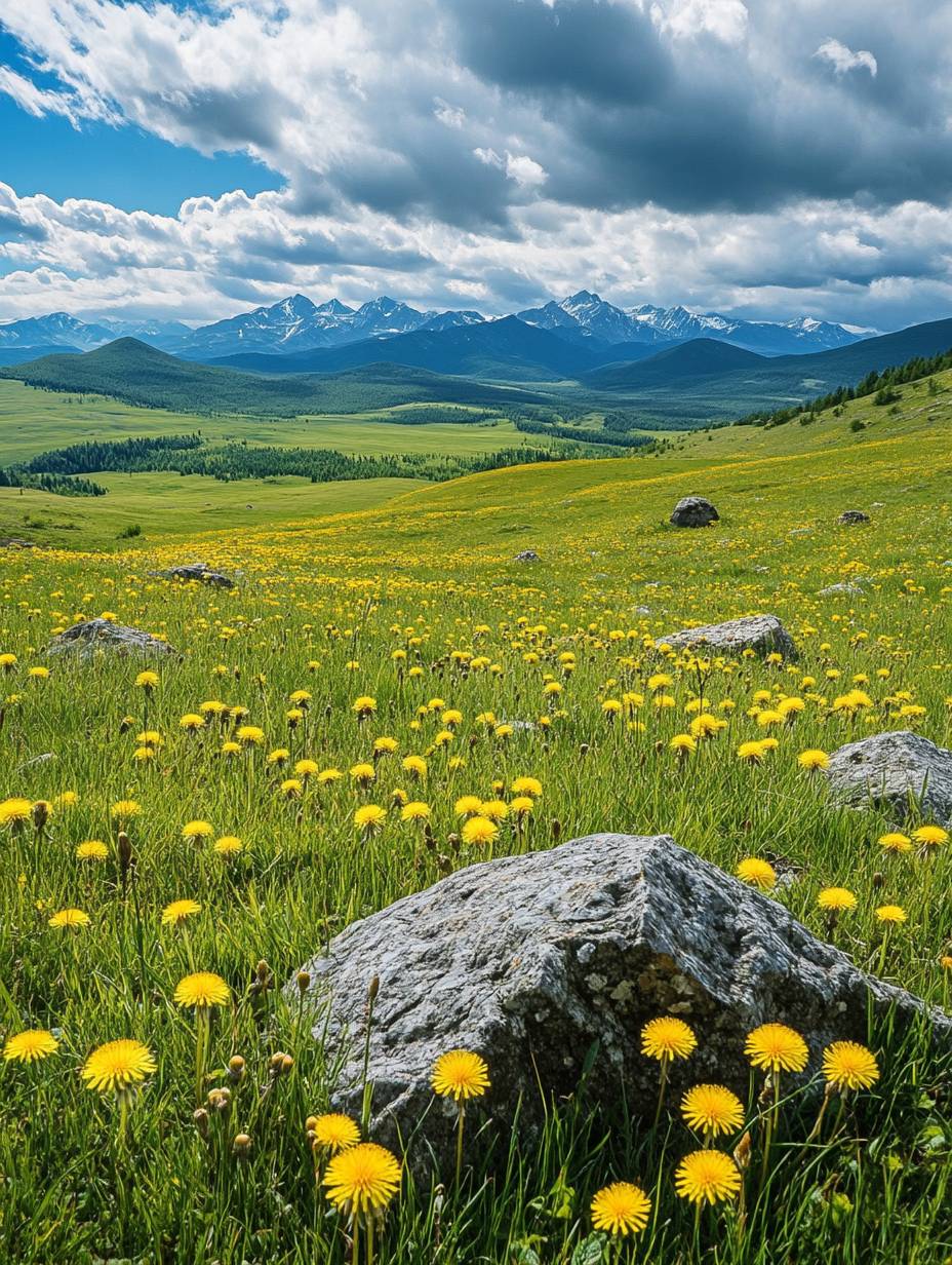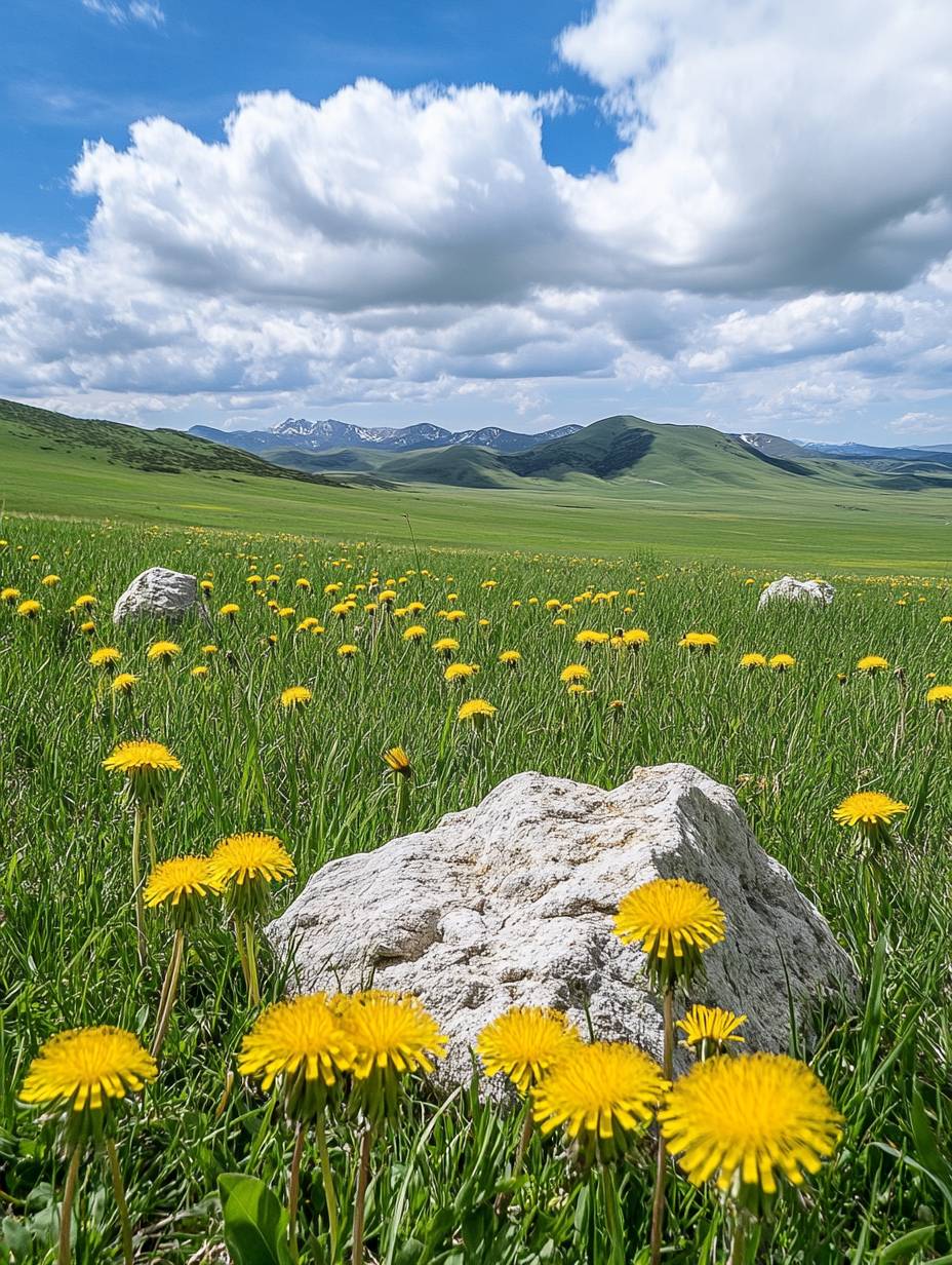 In the spring, there is an endless grassland in Cangbrook Mountain Scenic Area with yellow dandelions blooming on it and green grass everywhere. In front of you can see some small rocks scattered around. The distant view shows undulating mountains under white clouds. It's such a beautiful scene that I feel like flying up to experience its beauty. The photography captures the scene in high definition. --ar 3:4 --v 6.1