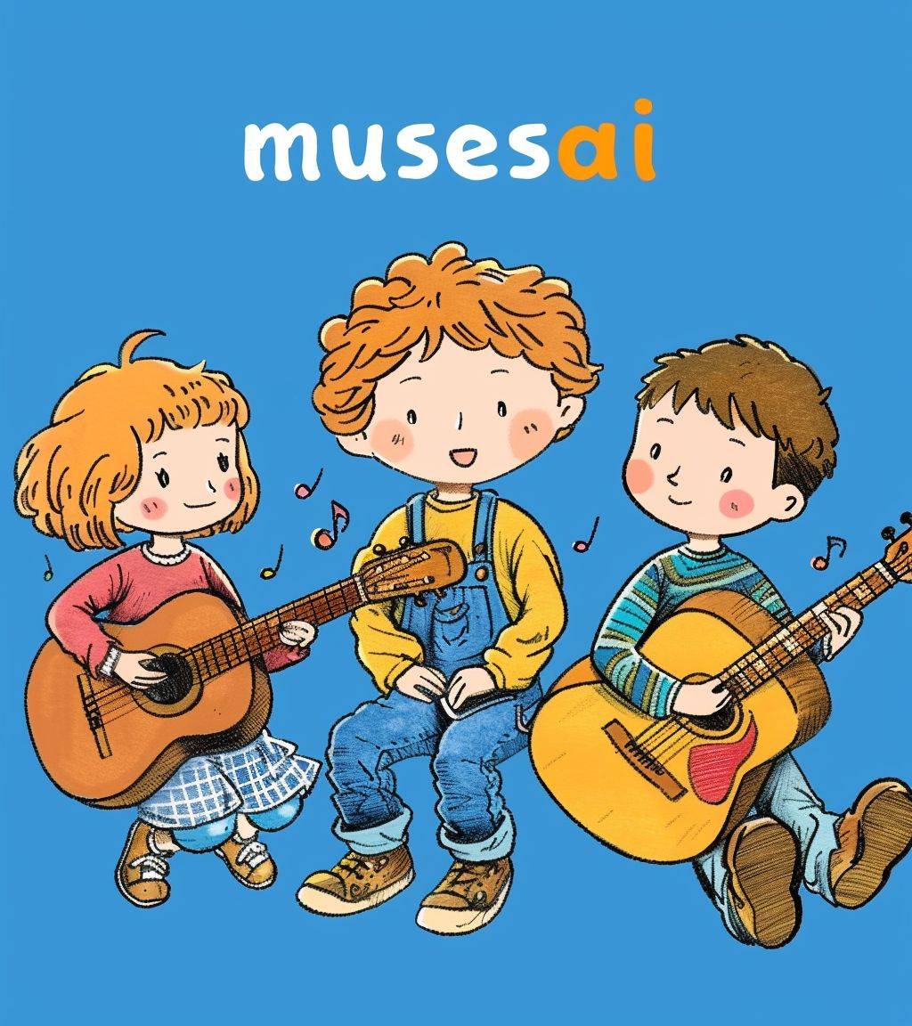 「musesai' 어린이 워크북 표지, 단순한 파란색 배경.