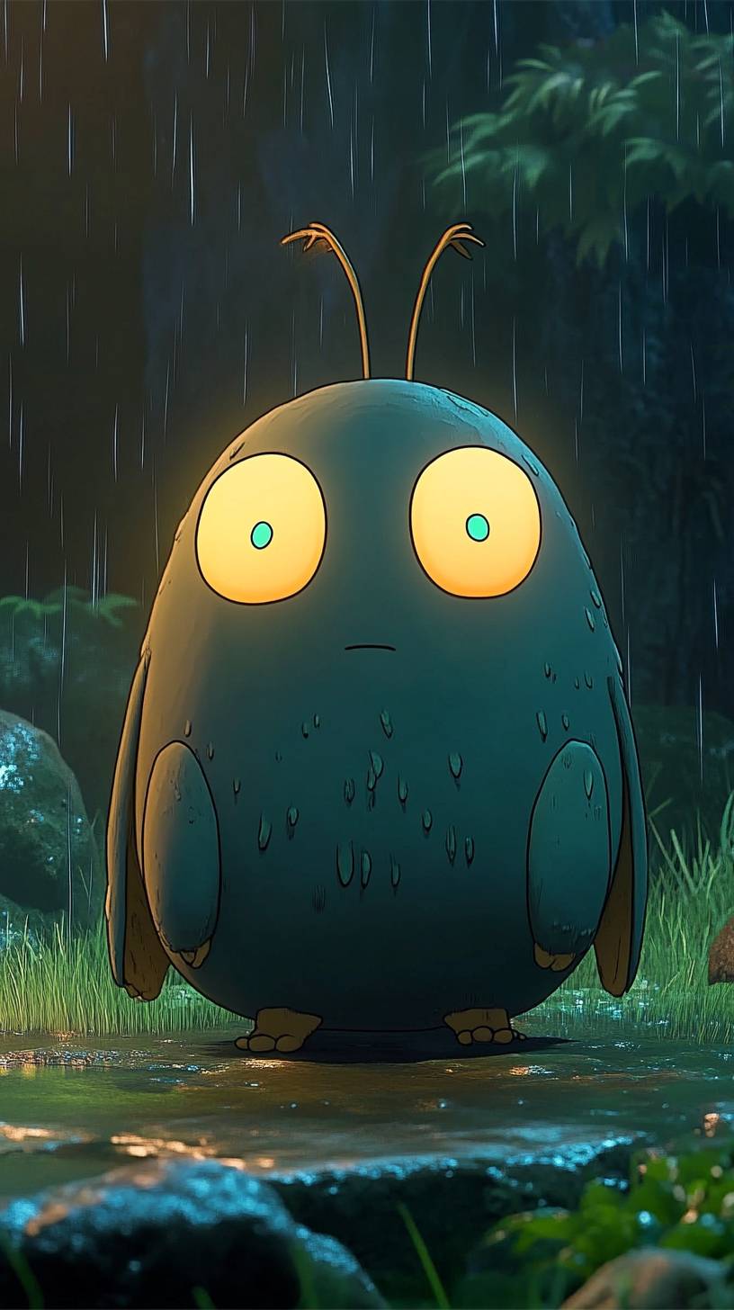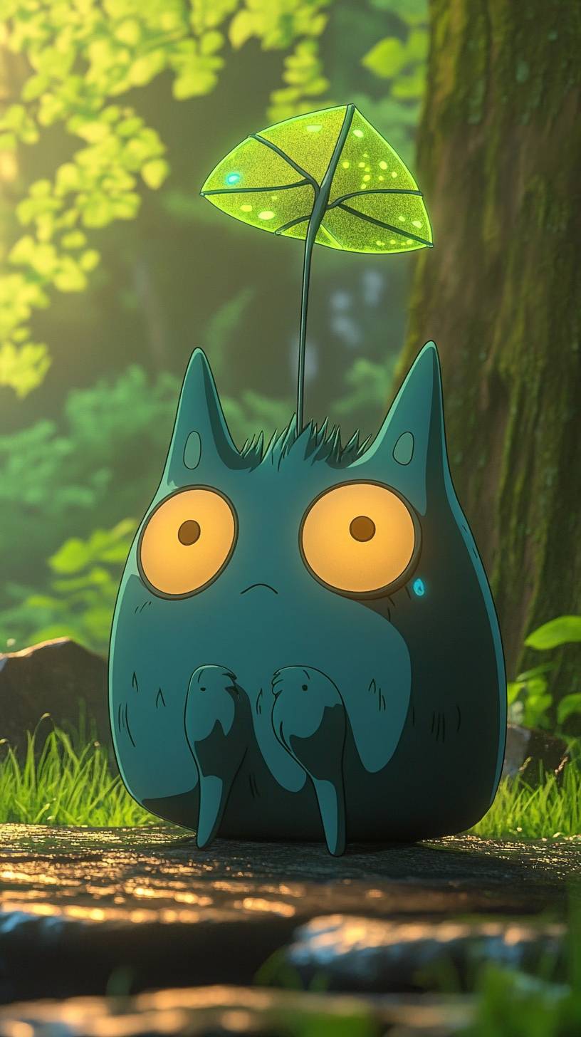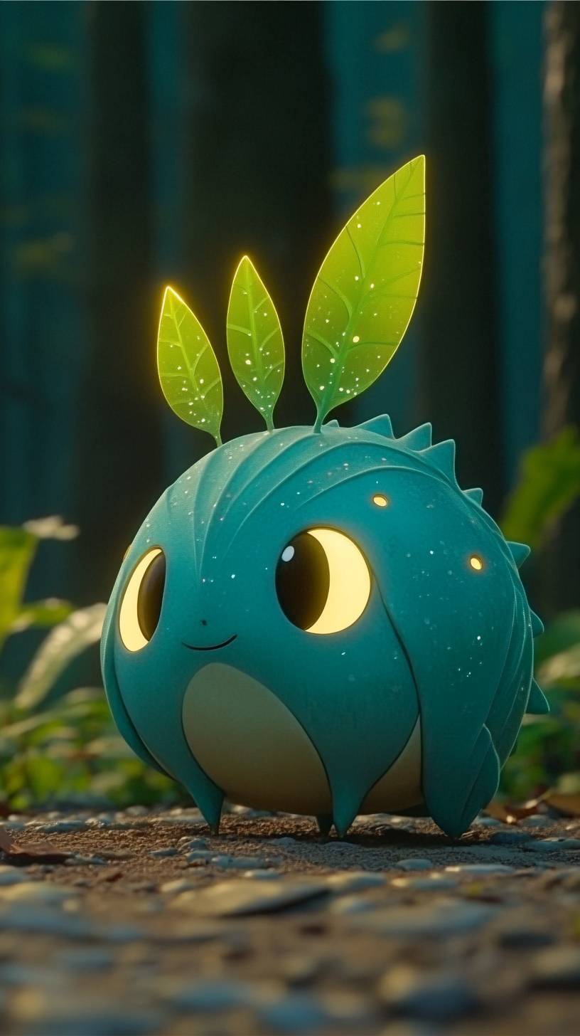 미야자키 스타일의 신비로운 동반자를 창조하세요: 작은 둥글고 뚱뚱한 생물로, 부드럽고 반짝이는 몸체가 황혼의 파랑에서 에메랄드 그린으로 색을 바꾸어가며 감정을 반영합니다. 이 생물은 깊은 지성과 호기심을 표현하는 크고 감정이 풍부한 눈을 가지고 있습니다. 짧고 둥근 팔다리는 부드러운 패드 발로 끝나 있어 조용하고 우아하게 움직일 수 있습니다. 섬세한 생물 발광 더듬이가 머리에서 자라 부드러운 빛을 내고, 등에는 투명한 날개 같은 부속지가 있어 effortlessly 떠다닐 수 있도록 해줍니다.