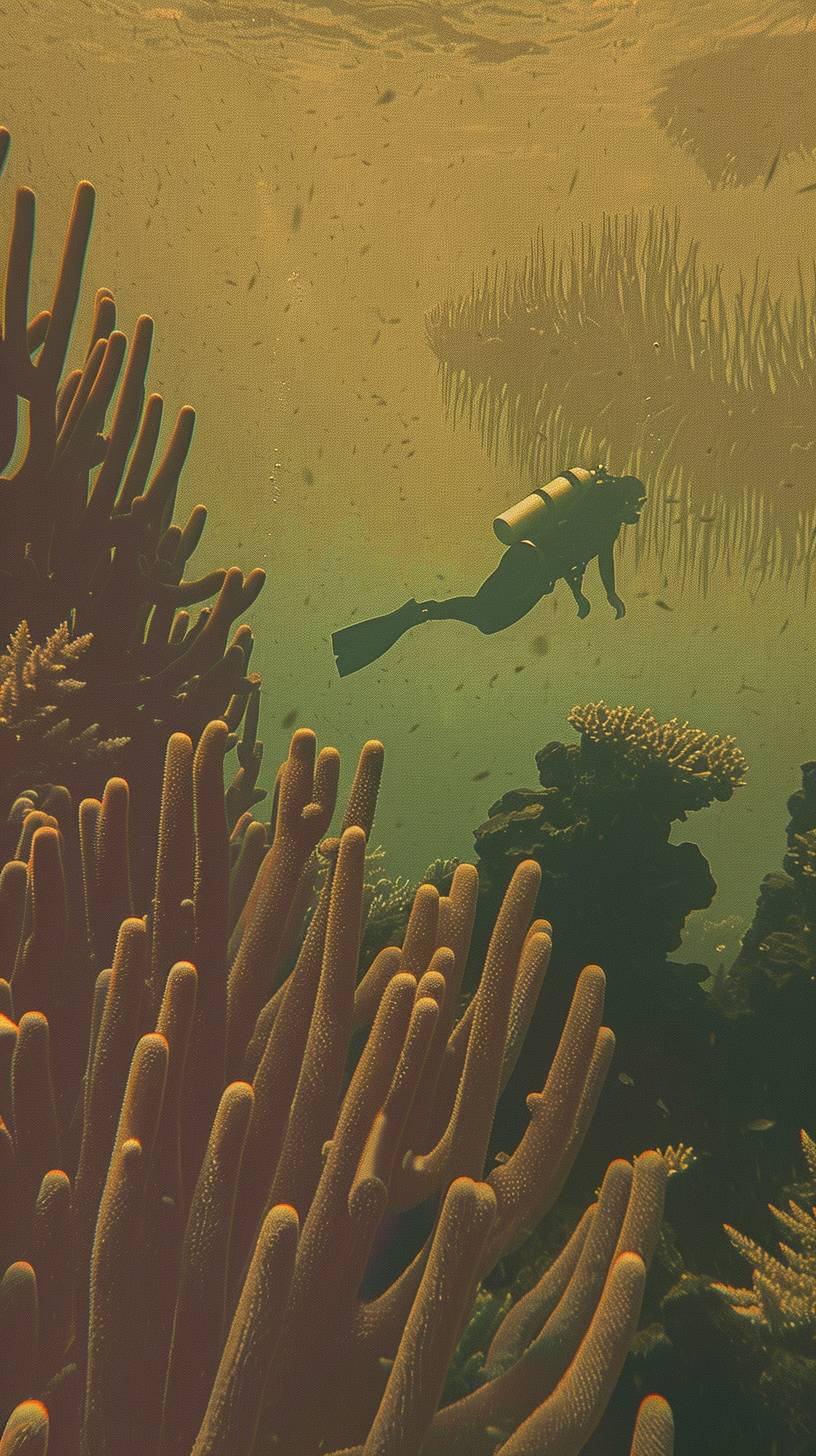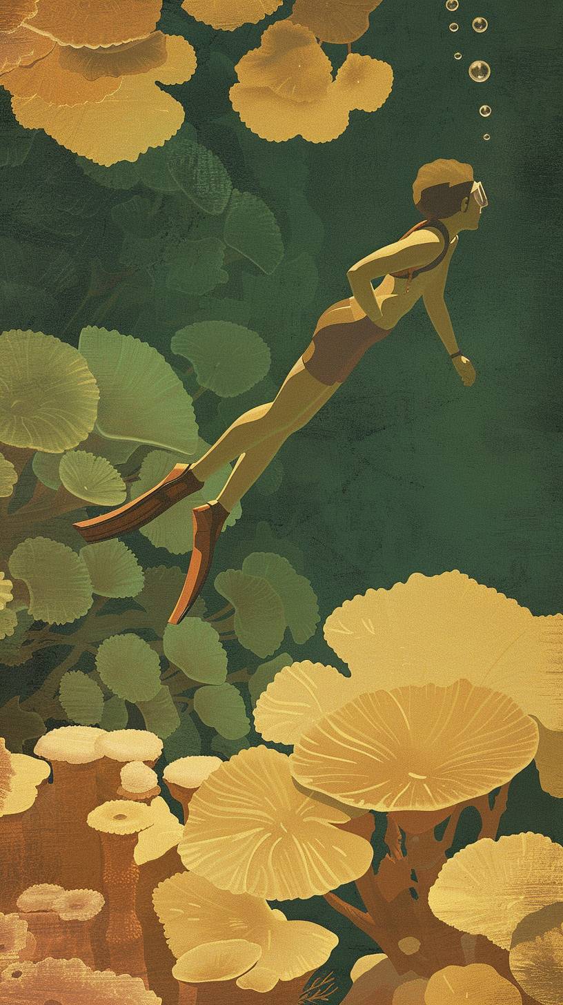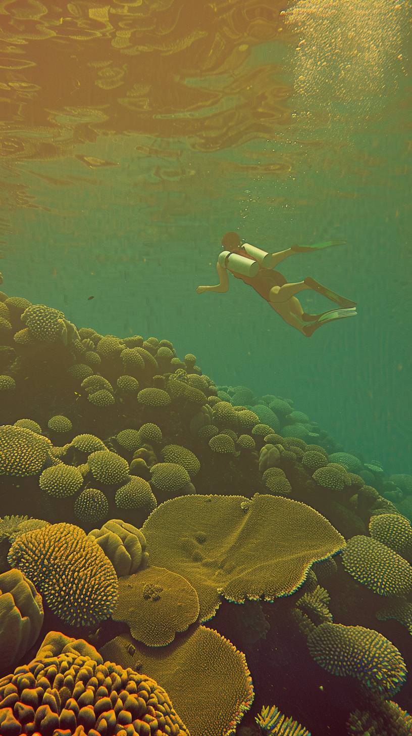 Mina is snorkeling in a coral reef. --ar 9:16 --sref 35 --v 6.0