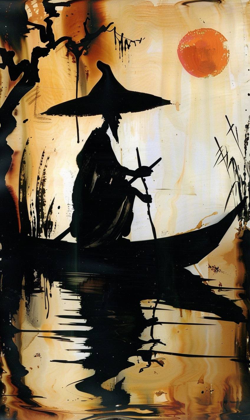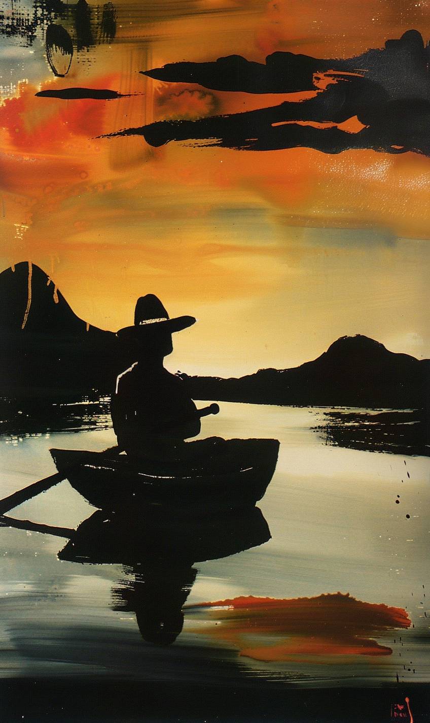 히로시는 잔잔한 호수에서 보트를 저어가고 있습니다.