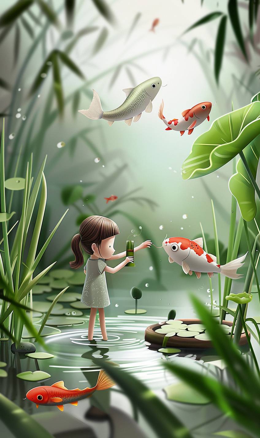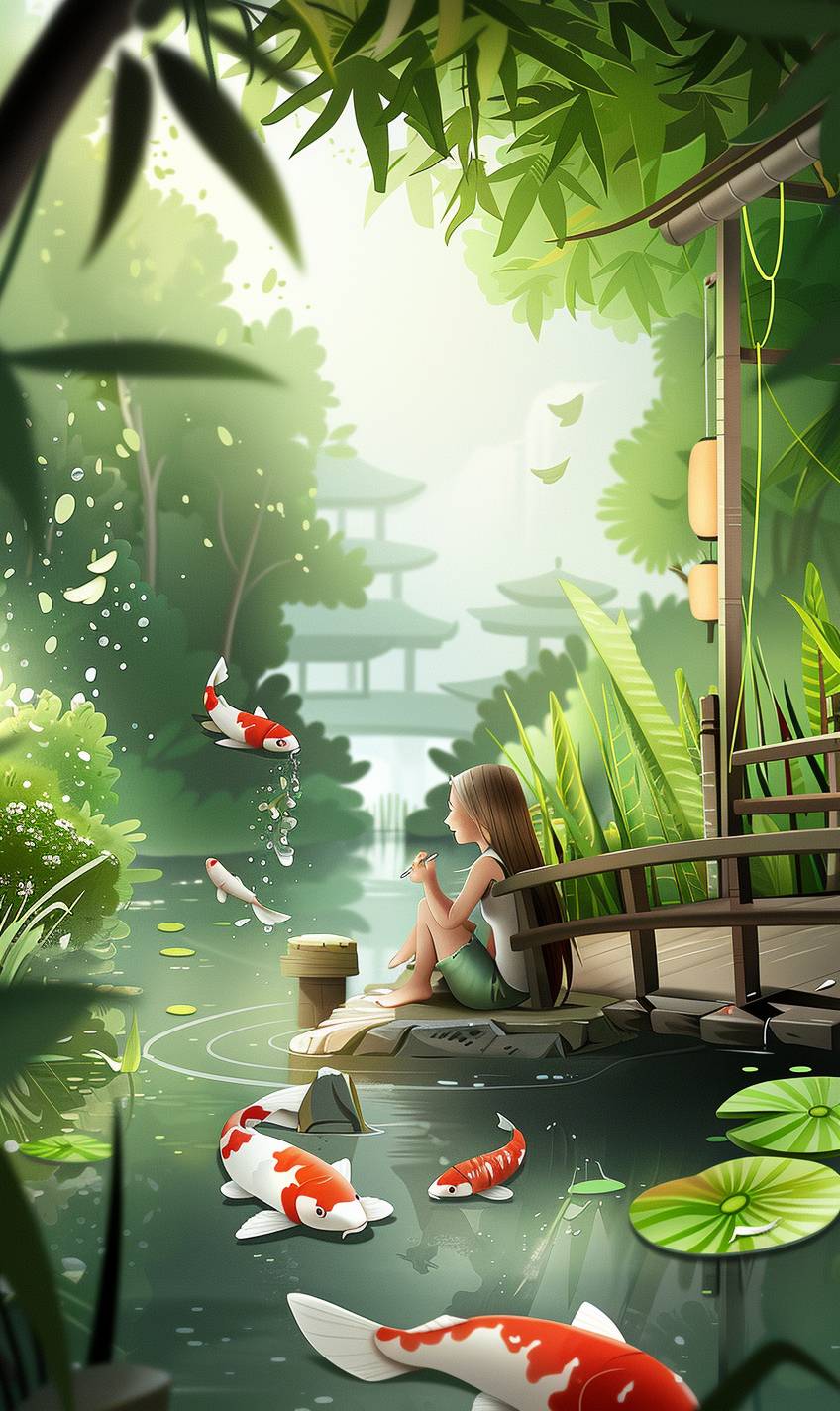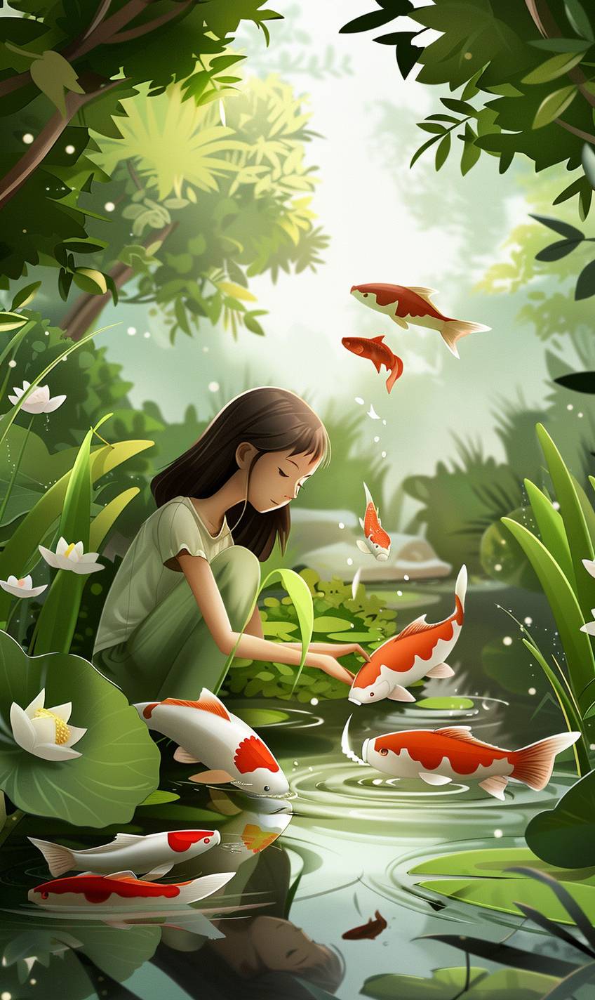 에미는 연못에서 코이 물고기에게 먹이를 주고 있습니다.