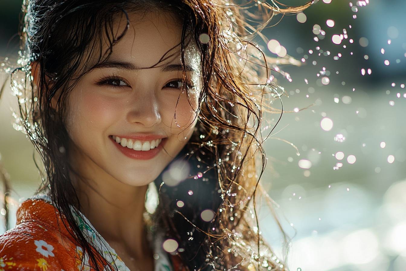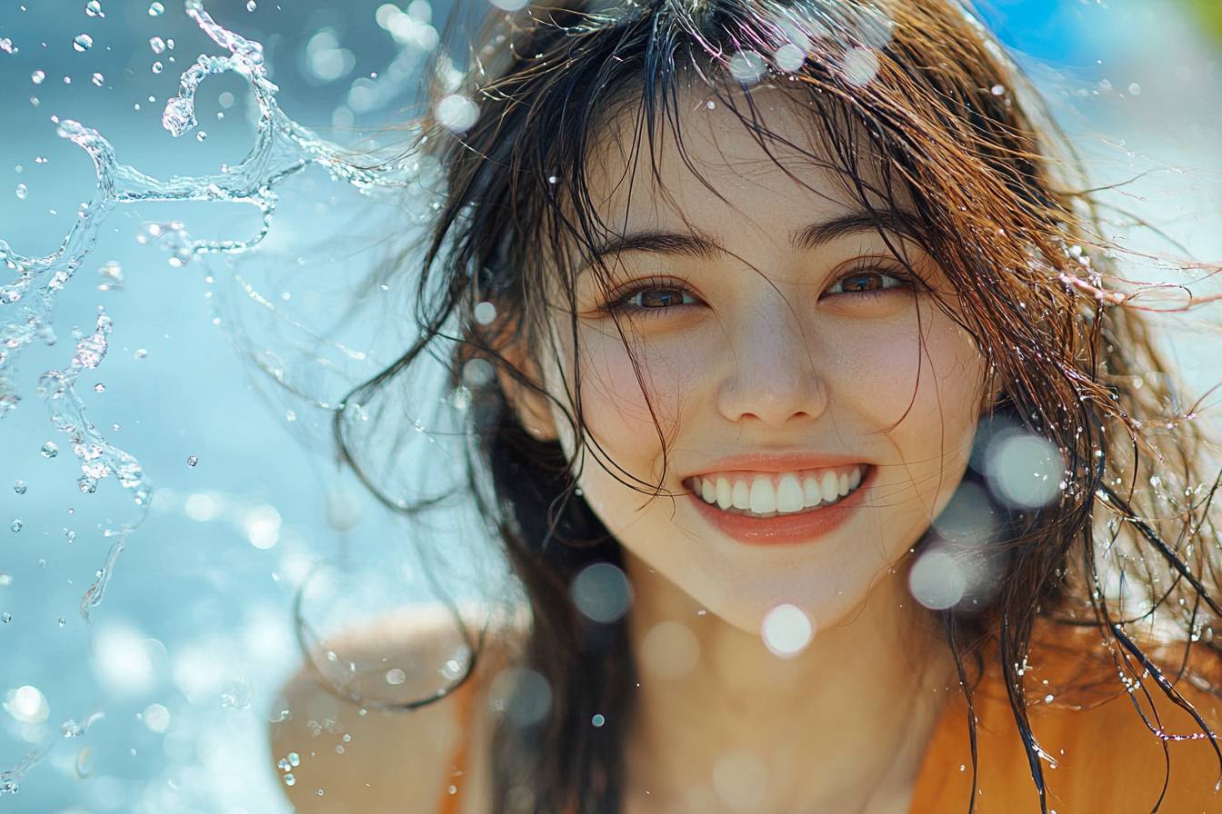 여름 도쿄에서 긴 머리의 일본 여성이 웃으며 파도 분무가 옷에 닿는다.