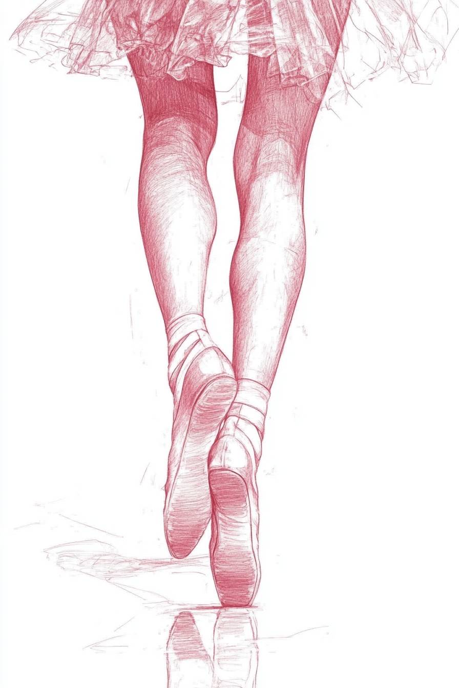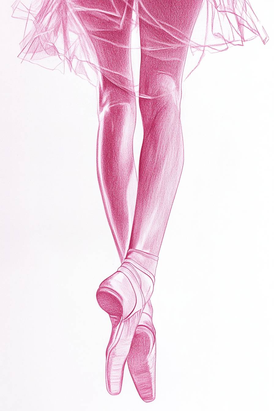 현대 일러스트레이터 João Ruas 스타일의 우아한 발레리나 연필 드로잉, 분홍색 슬리퍼, 흰색 배경