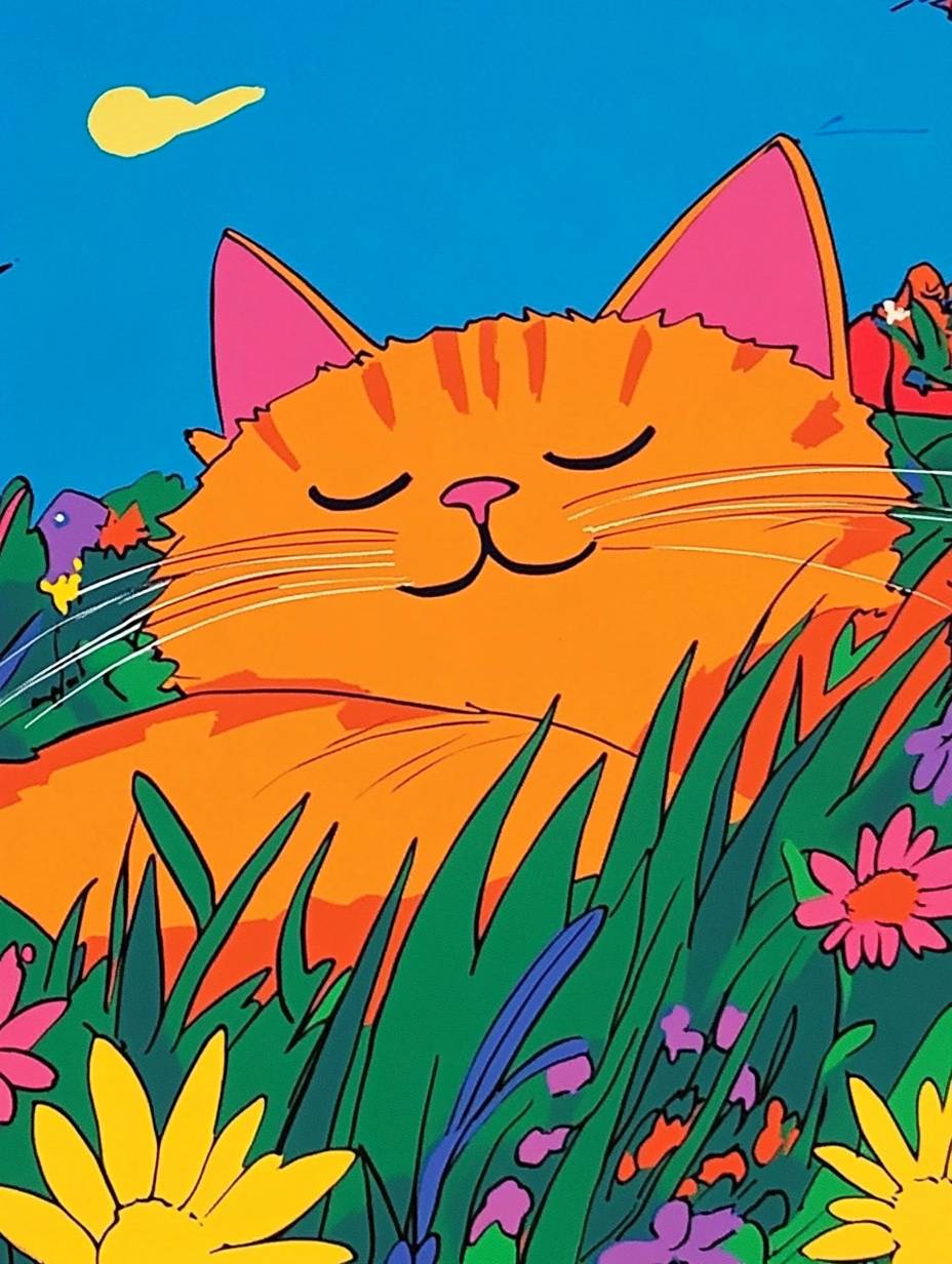 크고 귀여운 털복숭이 고양이가 풀밭에 누워 있고, 몇 사람이 고양이 배 위에서 행복하게 점프하고 있습니다.