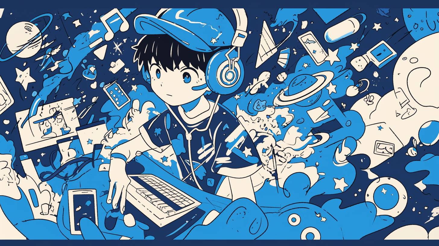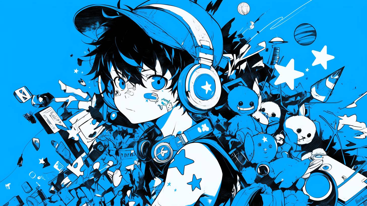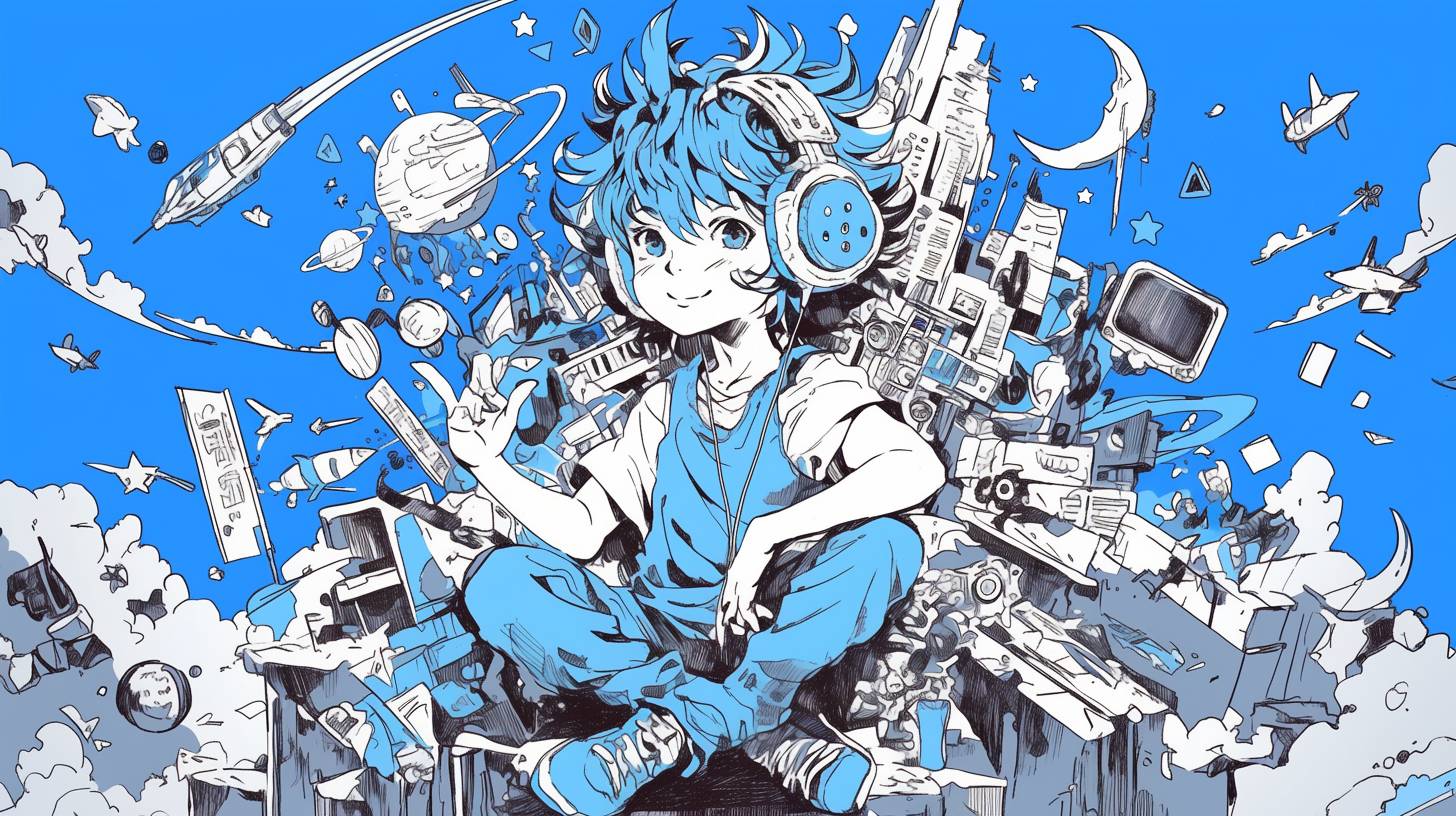 A 8-years-old cartoon boy wearing blue headphones surrounded by various elements, such as stars, planets, toys, doodle art and vector line drawing. This is a high-contrast black and white full-body photo of the character wearing a tank top, jeans, and a blue woolen hat, punk style, with a graffiti-style design and rich details, Japanese animation, drawn by Takashi Murakami, blue background, UHD --ar 16:9 --niji 6
