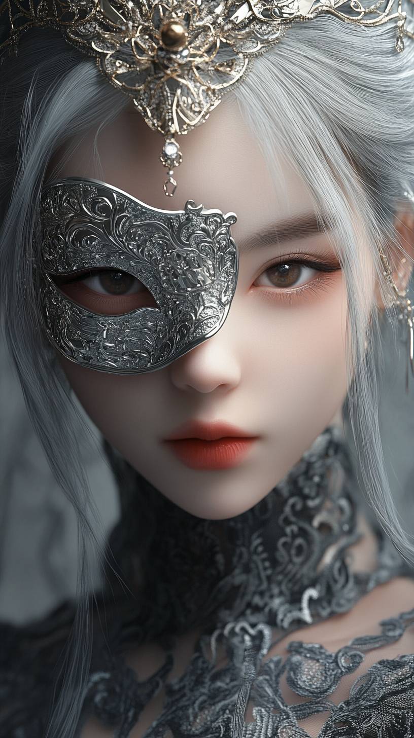 화려한 은색 아이 마스크를 착용한 동양 여성, 고화질, 세련된 얼굴, 은회색 머리, 보통 목, 정교한 헤어스타일, 상세한 설명, 대칭 구도, 완벽한 신체 비율.