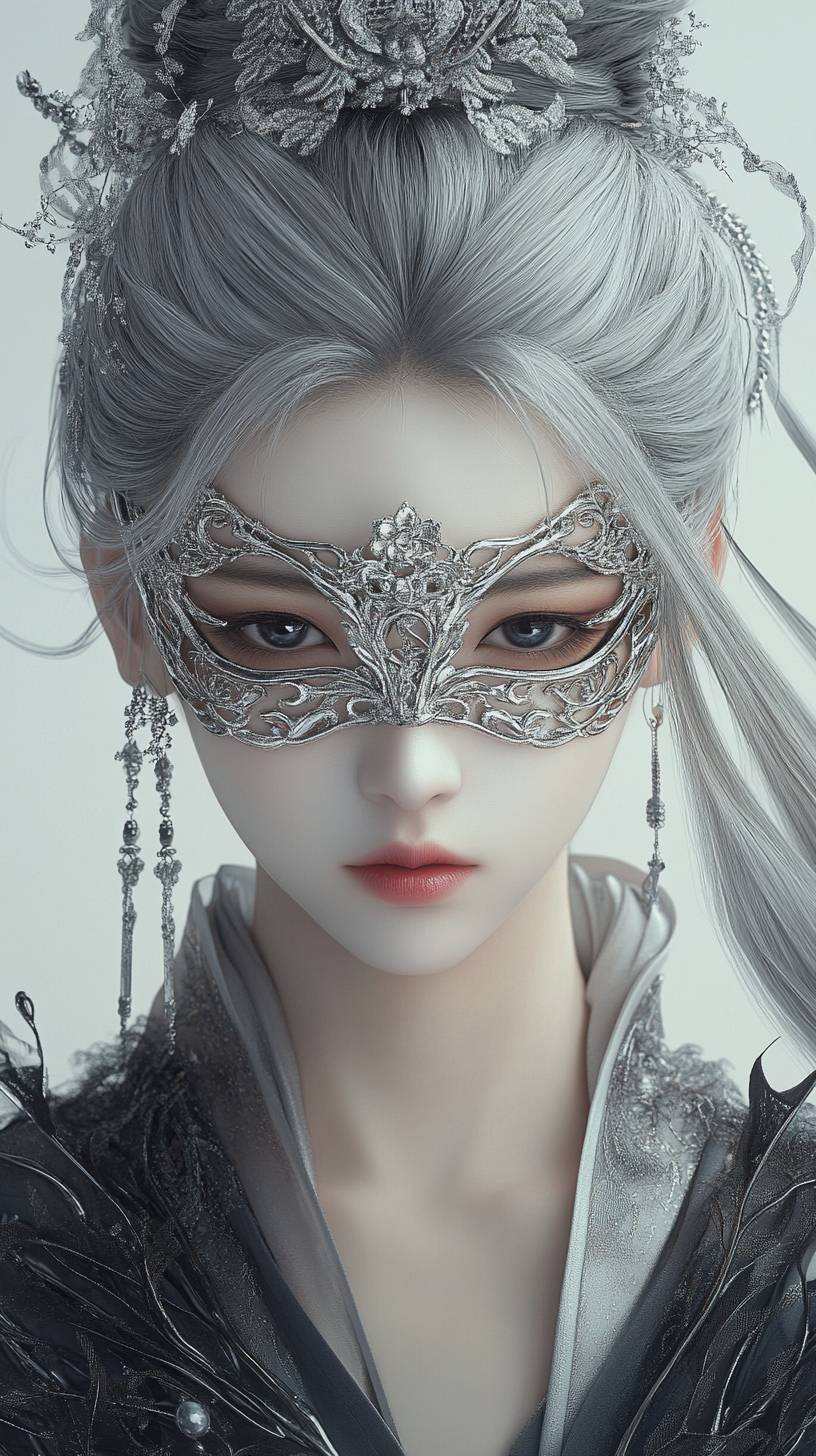 Wearing gorgeous silver eye mask, high definition, masquerade oriental woman, exquisite face, silver gray hair, normal neck, exquisite hairstyle, exquisite detail description, symmetrical composition, perfect body proportion --ar 9:16 --v 6.1