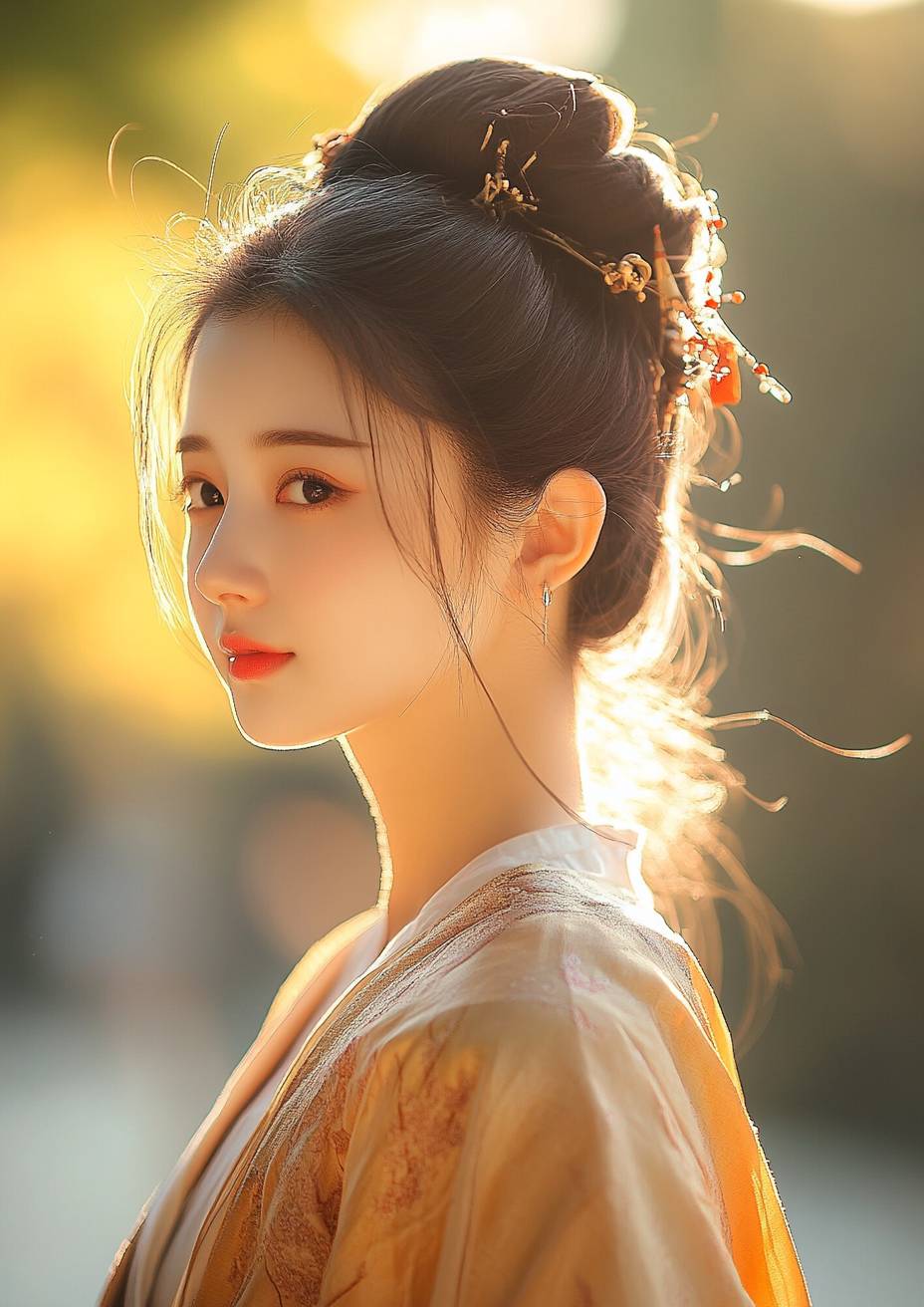 Chinese girl, Sunshine, The Tang Dynasty Hanfu was exquisite, Hairstyle is exquisite, Happy, Photographic style panorama --ar 5:7 --v 6.1