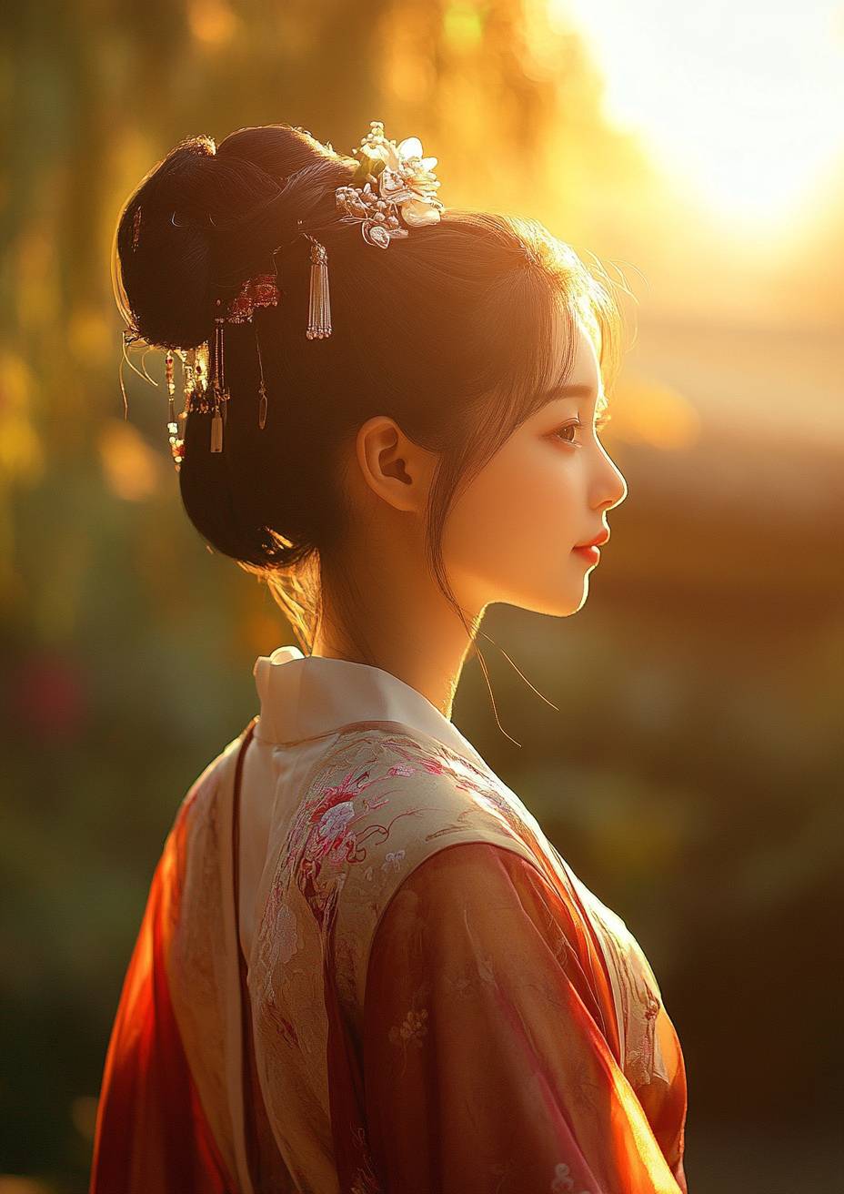 중국 소녀, 햇빛, 당나라 한복은 정교하고, 헤어 스타일이 정교하며, 행복하고, 사진 스타일 파노라마