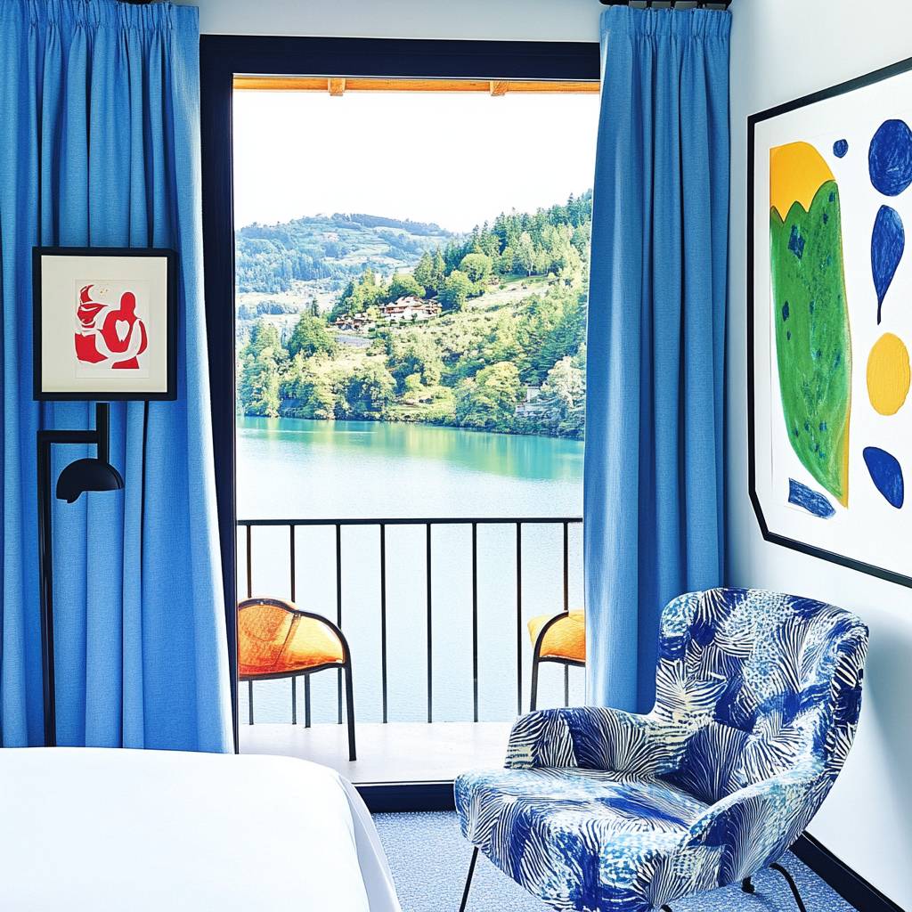 아름다운 호수와 언덕 배경이 보이는 고급스러운 객실입니다.