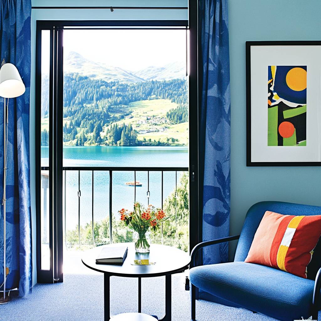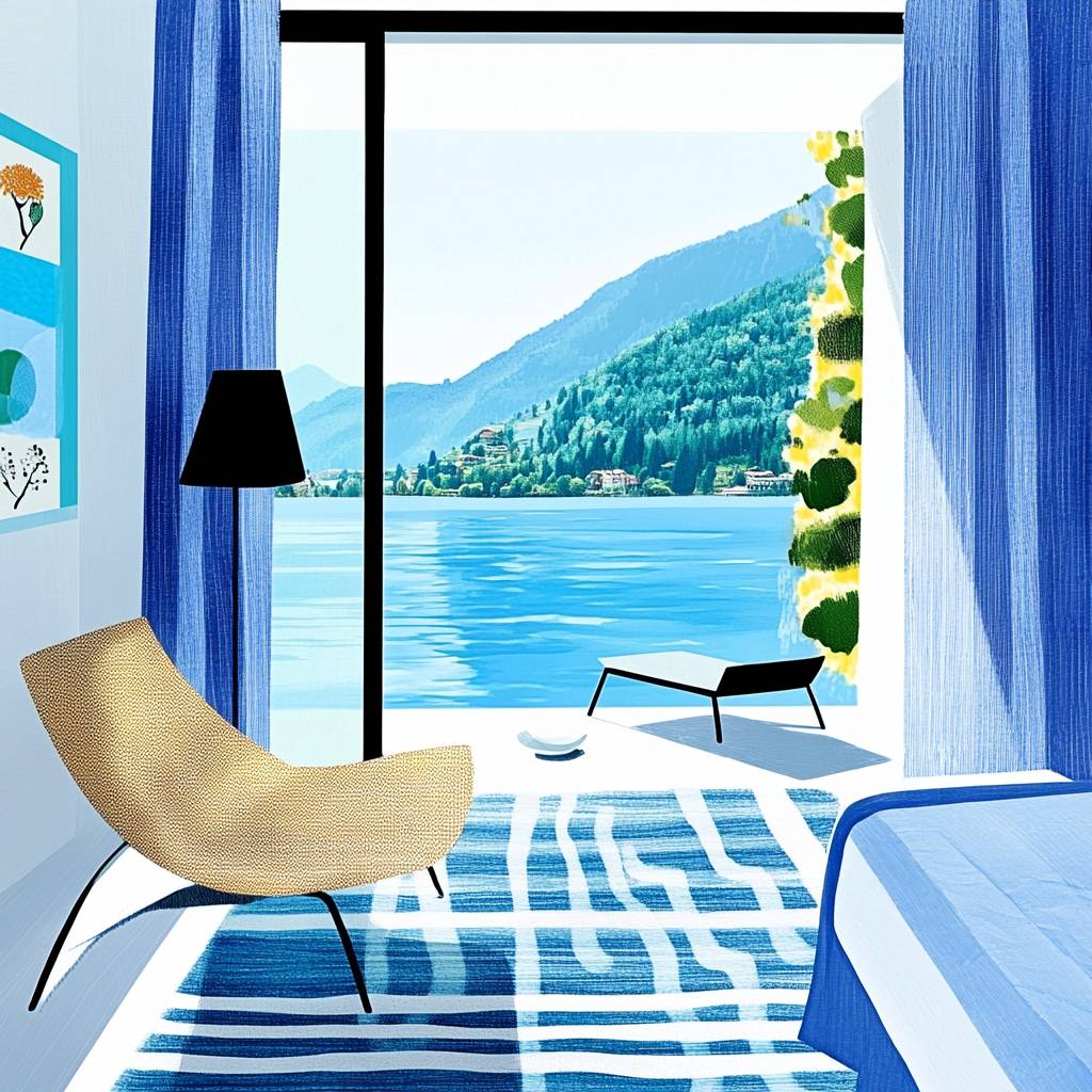 Luxury room with view of beautiful lake with hill background --sref 646371579 --v 6.1