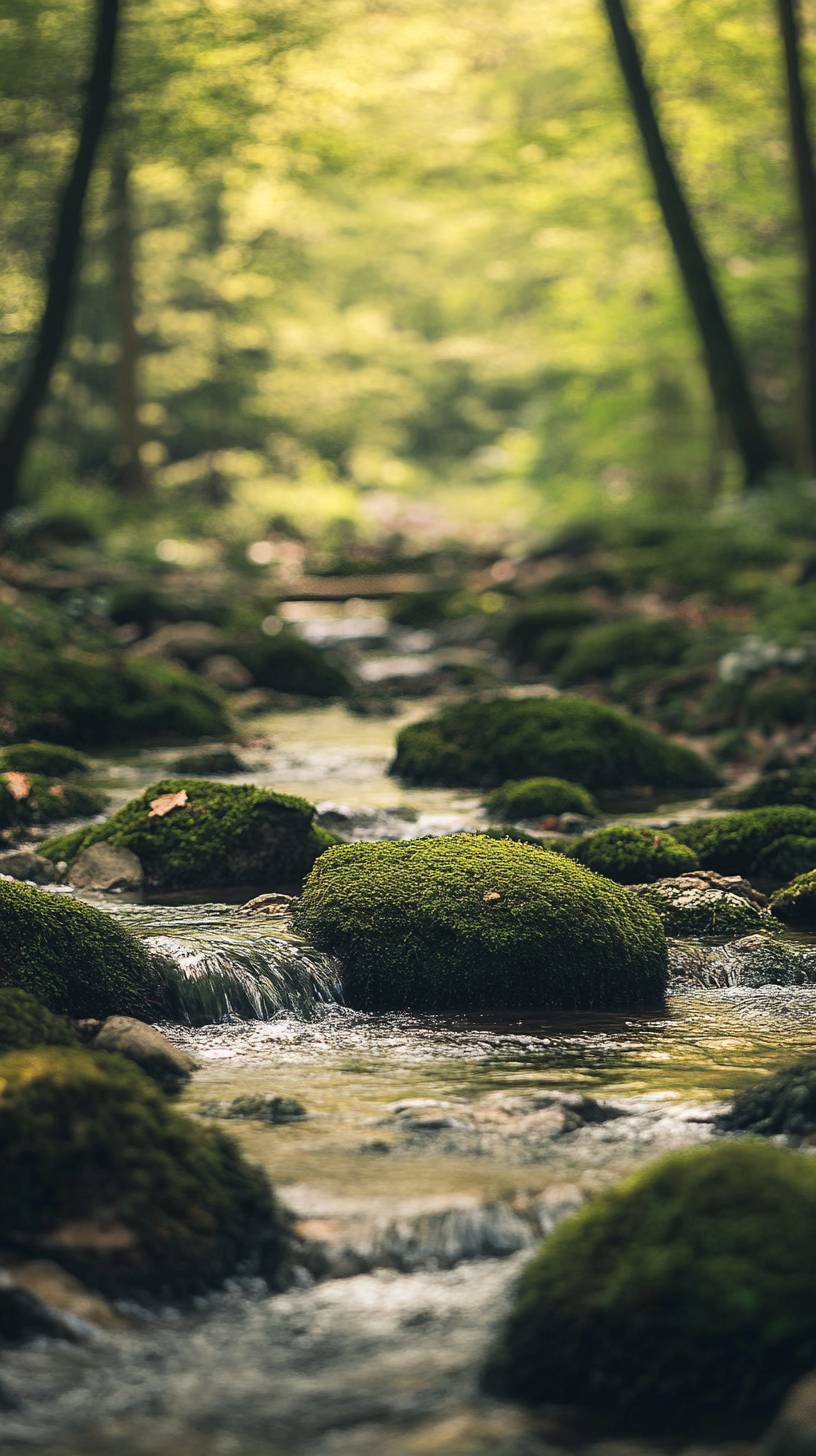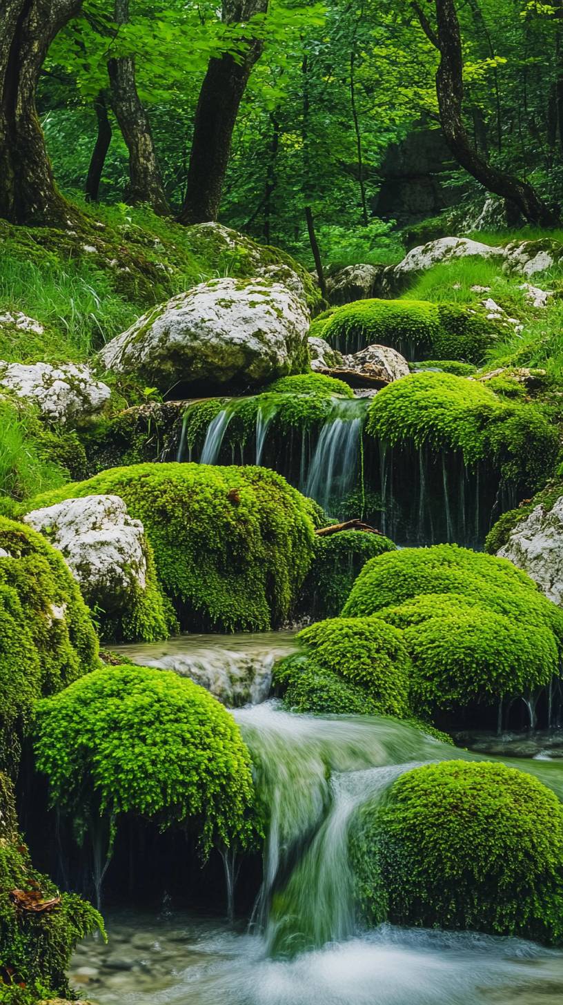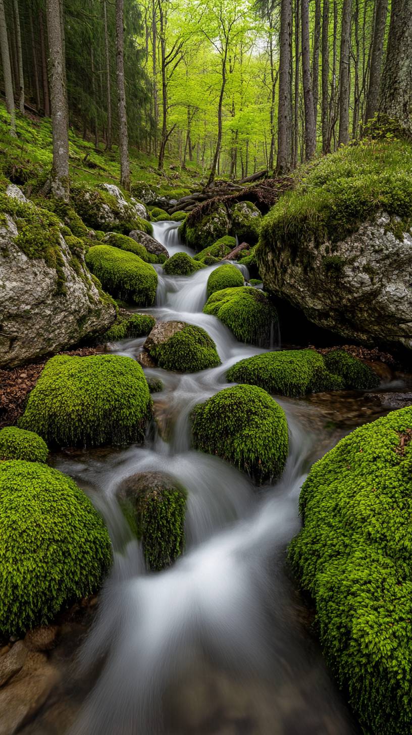 Beautiful green, mossy rocks with flowing water in the forest, in high definition, captured by a Canon EOS camera, --ar 9:16 --v 6.1