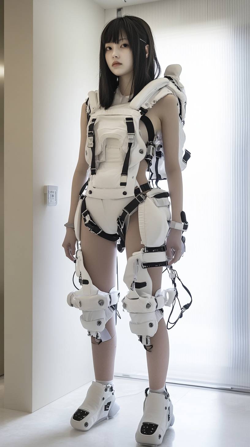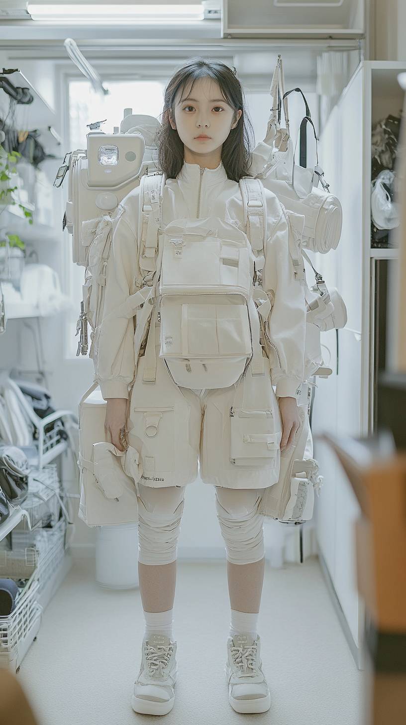 다양한 스타일과 기능으로 재구성할 수 있는 모듈형 의상을 입은 18세 일본 소녀. 이 의상은 교체 가능한 구성 요소와 액세서리로 구성되어 있어 착용자가 다양한 상황에 적응하고 개성을 표현할 수 있습니다. 그녀는 미래적인 아파트에 서 있으며 이 혁신적인 워드로브 시스템의 적응성과 다재다능성을 보여줍니다.