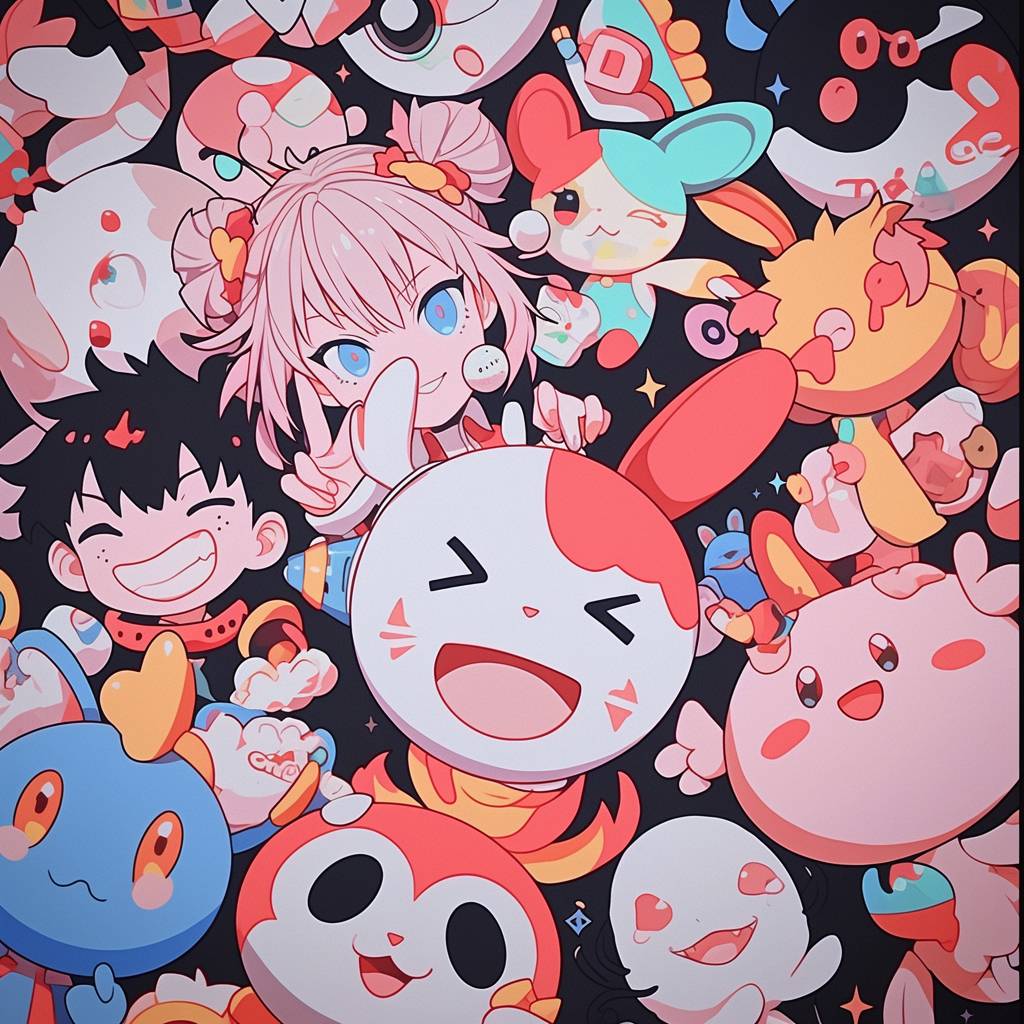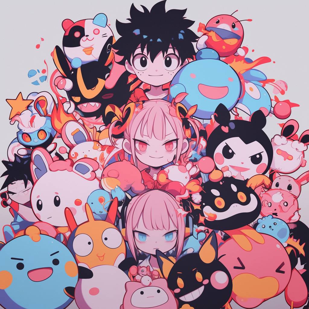 인기 애니메이션 및 만화 10가지가 함께하는 파티, 큰 줌 아웃, 흰색 배경