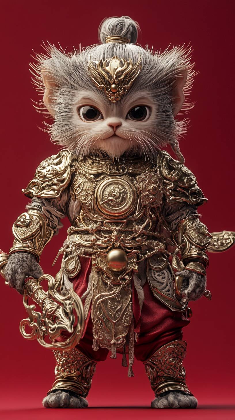 Blind box style, Monkey King full-body photo, Persian cat face, silver hair and gold armor, weapon in hand, super cute expression on face, fine detail, solid color background, 3D rendering effect, Octane rendering, C4D, Blender, Clean background --ar 9:16 --v 6.1