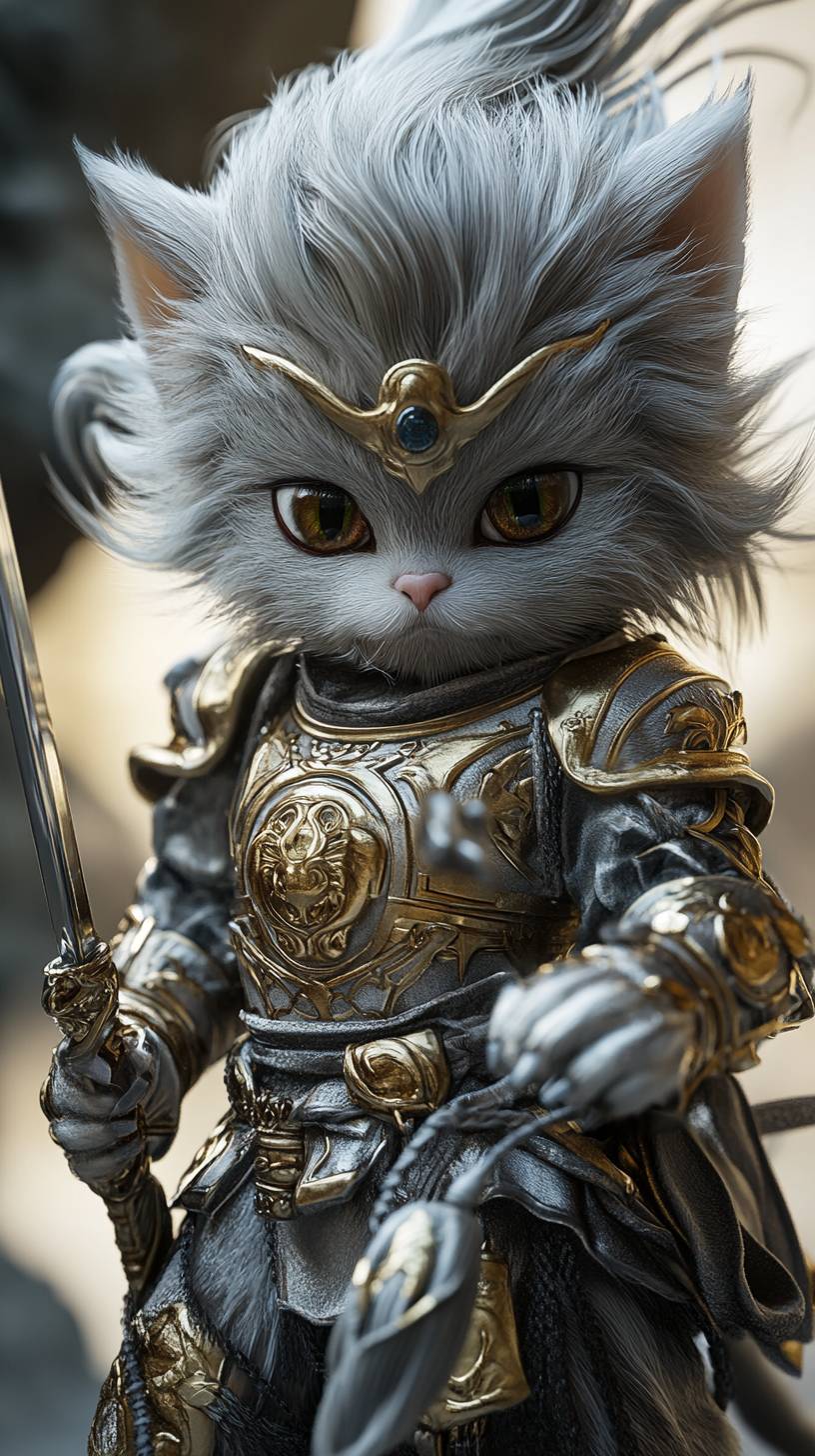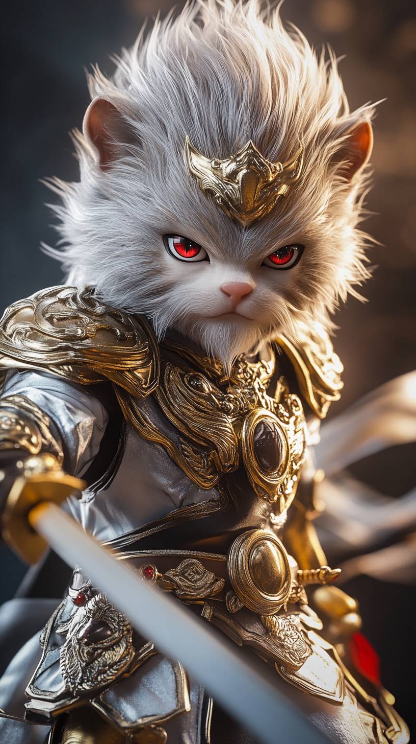 블라인드 박스 스타일, 손오공 전신 사진, 페르시안 고양이 얼굴, 은빛 머리와 금색 갑옷, 손에 무기, 매우 귀여운 표정, 세밀한 디테일, 단색 배경, 3D 렌더링 효과, Octane 렌더링, C4D, Blender, 깨끗한 배경