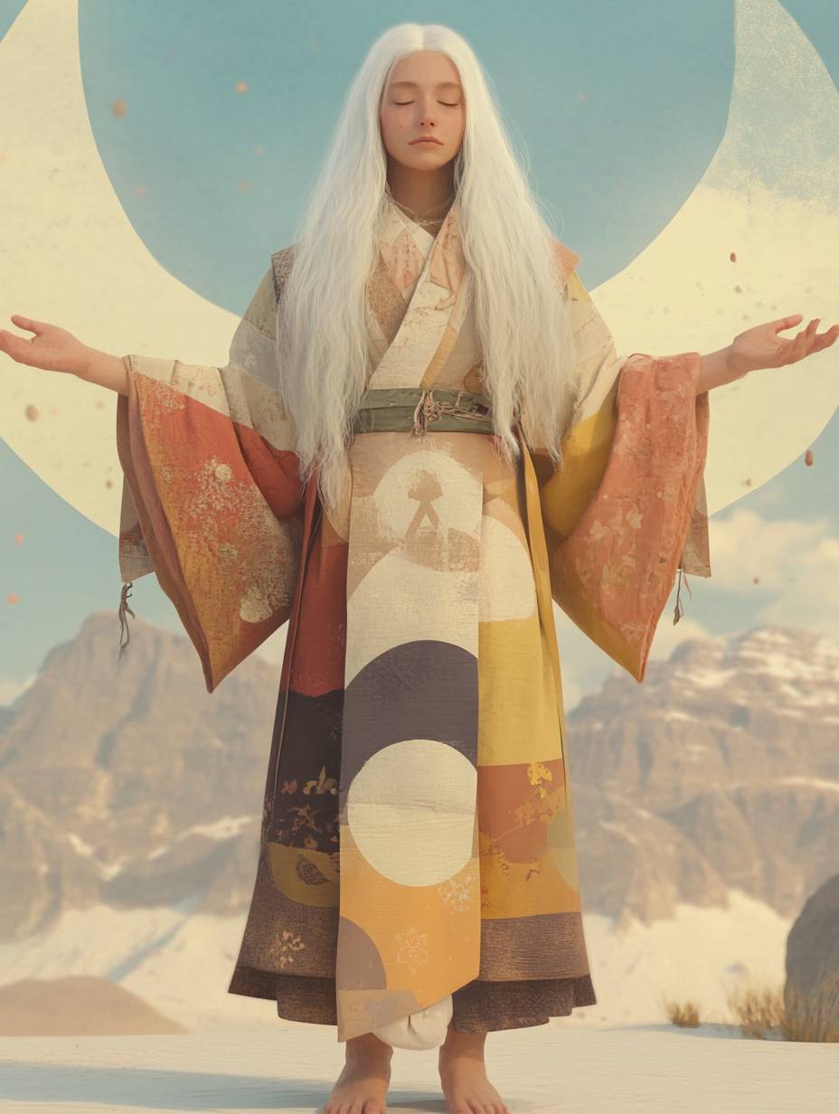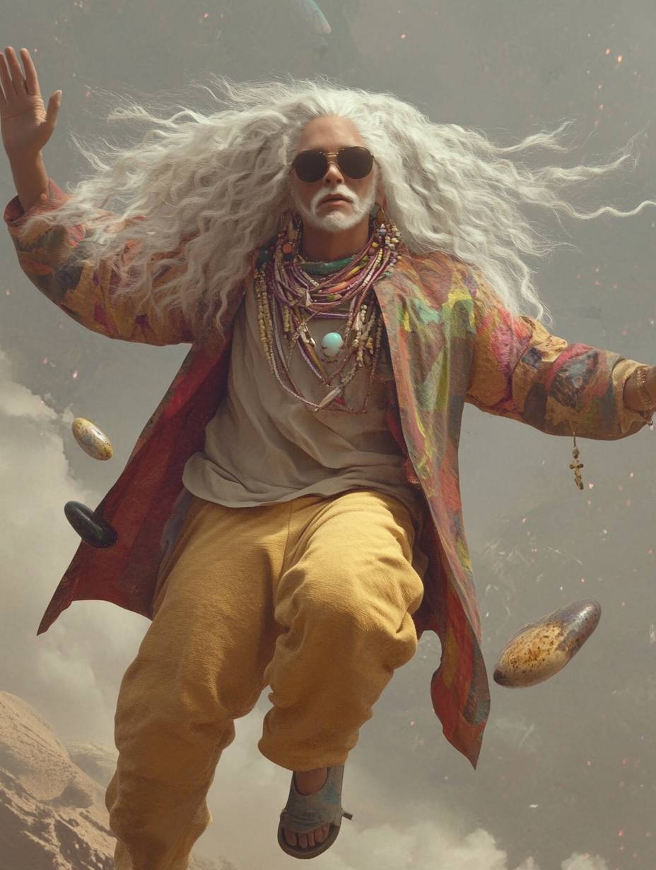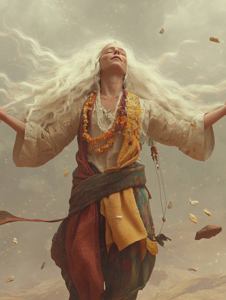 기발한 캐릭터, 긴 흰 머리, 다채로운 의상, 과장된 비율, 표현력이 풍부한 포즈, 기발한 디지털 아트 스타일