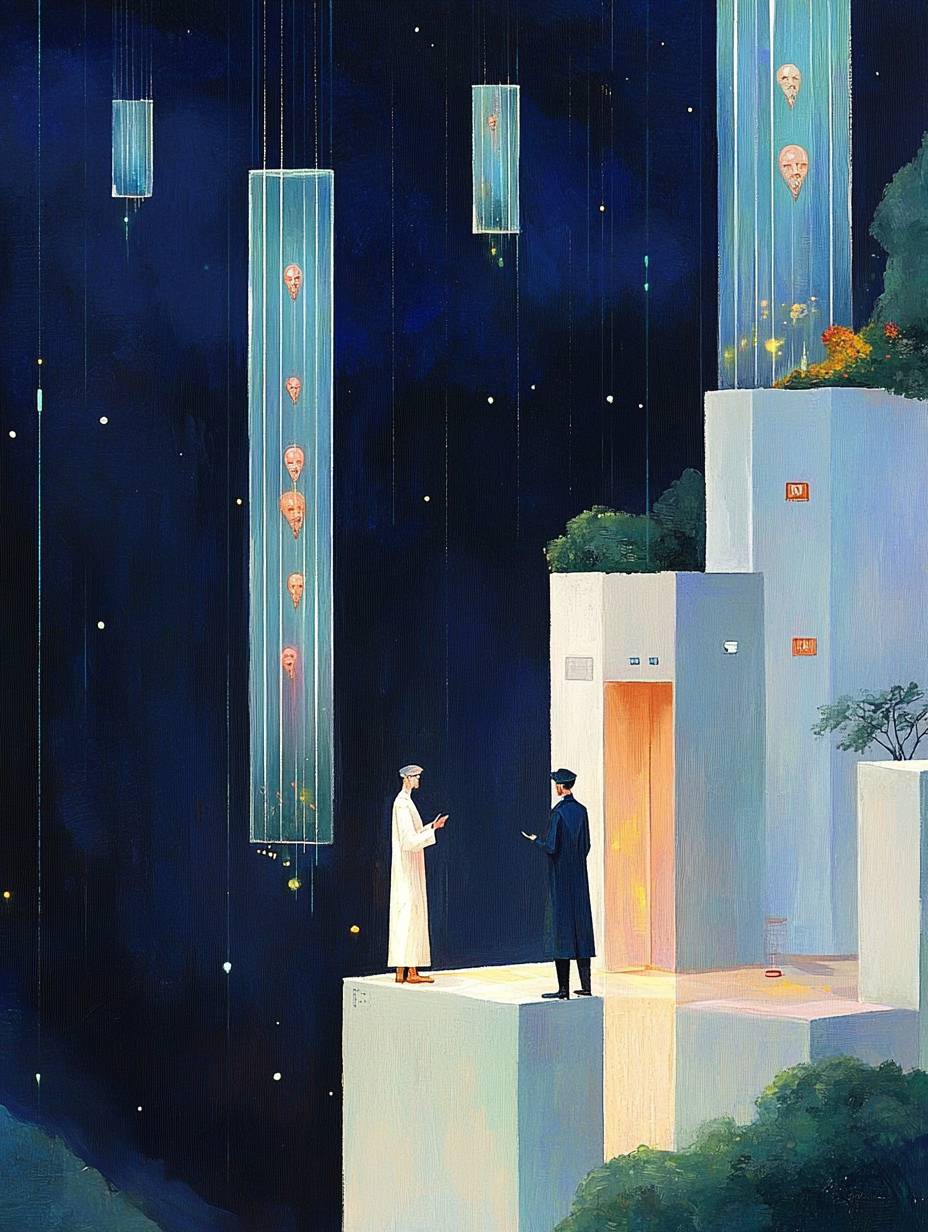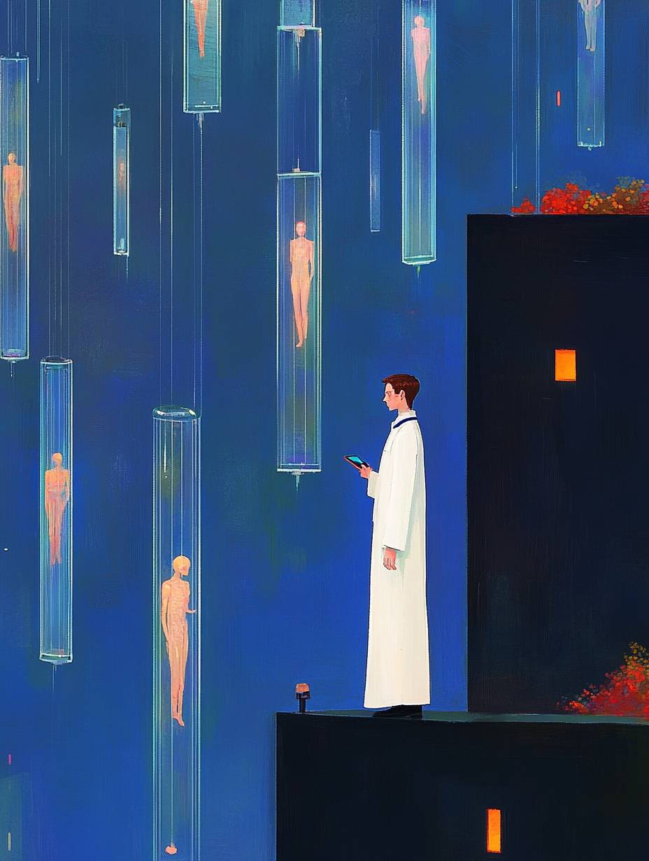 사이버펑크 느와르 스타일, 높은 유리 튜브에는 떠 있는 인간 형태가 담겨 있고, 긴 코트를 입은 관찰자들이 표본을 연구하고 있습니다. 불길한 빛이 미래의 실험실에 스며들고, 인간 보존, 유전자 실험, 윤리적 딜레마, 첨단 생명공학, 강한 원근감이 있는 반복적인 수직 요소가 존재합니다. 어두운 복도가 있는 고급 기술 연구 시설, 청록색과 호박색의 네온 백라이트, 뚜렷한 대비, 차가운 파랑과 따뜻한 호박 색의 색상 팔레트가 특징입니다.