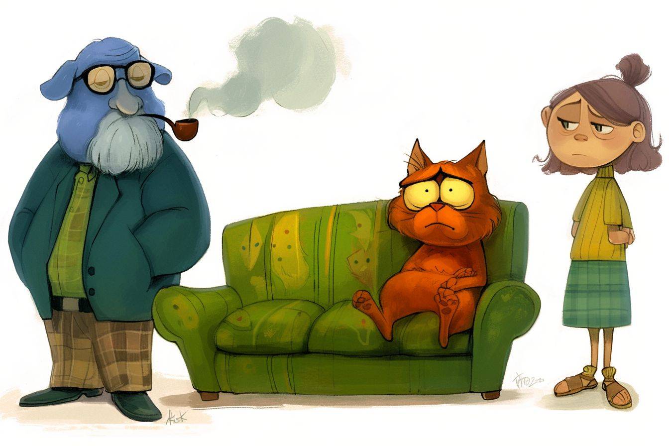왼쪽 캐릭터는 담배를 피우고 안경을 쓴 늙은 파란 개가 입에 파이프를 물고 있고, 중앙 캐릭터는 초록색 소파에 앉아 있는 주황색 고양이이며, 오른쪽은 고양이 옆에 서 있는 슬픈 표정을 지은 작은 소녀입니다. 어린이 책 스타일, 픽사 카툰 아트 스타일.