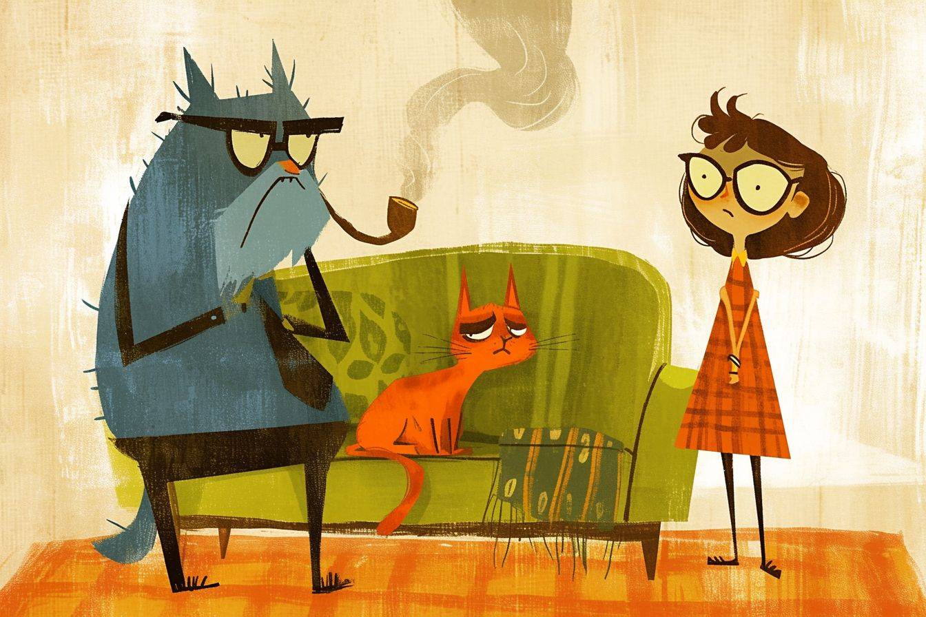 왼쪽에는 담배를 피우는 파란 개, 가운데에는 초록 소파에 앉아 있는 주황 고양이, 오른쪽에는 슬퍼 보이는 작은 소녀가 있는 만화 일러스트입니다.
