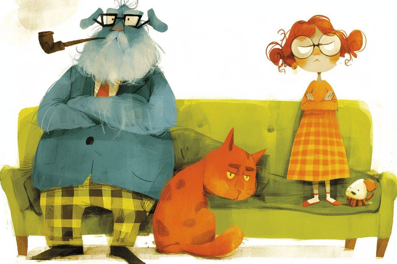 cartoon illustration of three characters, the character on the left is an old blue dog smoking and wearing glasses holding a pipe in his mouth, the middle character is an orange cat sitting on a green couch, the right side is a small girl standing next to the cat looking sad. In the style of a children's book, Pixar cartoon art style. --ar 3:2 --niji 6 --style raw