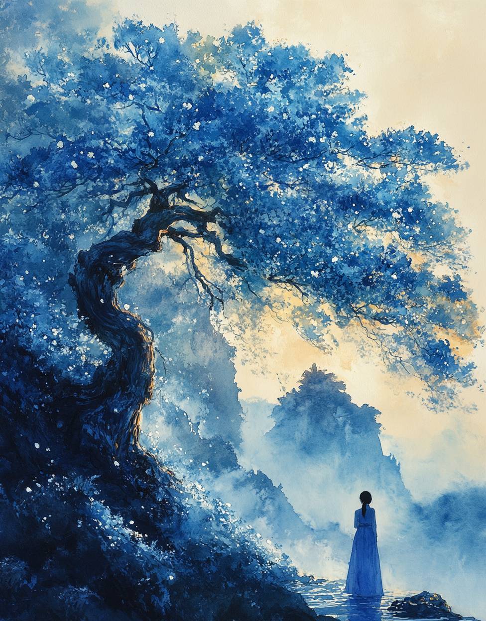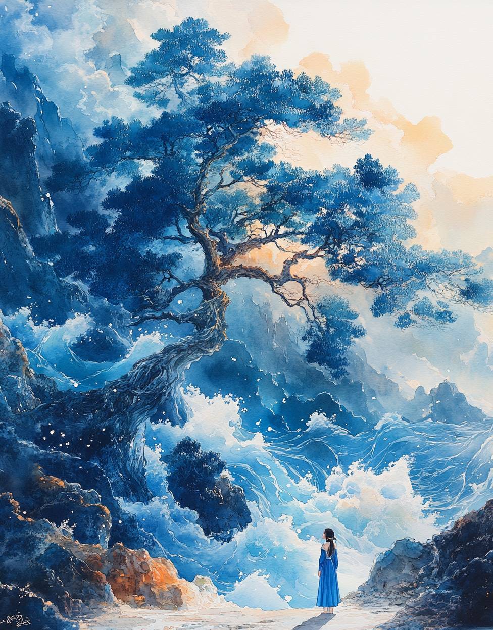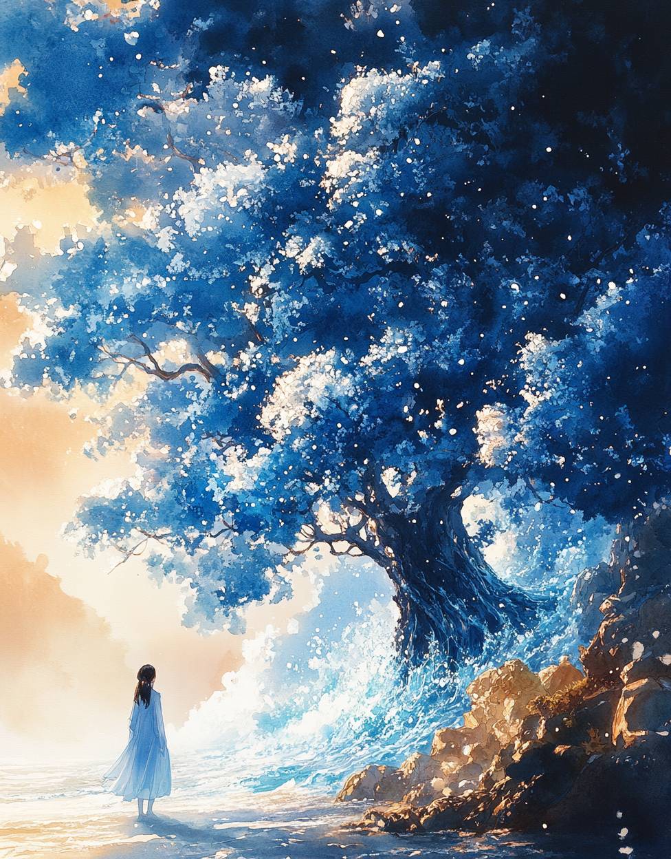 초현실적인 바다가 거대한 나무로 변하는 수채화. 짙은 파란색 물이 나무 줄기로 변하고, 가지는 하늘로 뻗어 있다. 가지에는 수많은 흰색 파도가 장식되어 있으며, 각각은 피어난 꽃처럼 보이고 햇빛 아래에서 반짝인다. 한 중국 여성이 해변에 서서 장엄한 광경을 바라보고 있으며, 그녀의 모습은 광활하고 마법 같은 바다 풍경에 비해 작아 보인다. 배경에는 부드럽고 흐릿한 지평선이 있으며, 햇빛이 전체 장면에 따뜻한 빛을 비추어 꿈같은 분위기를 만든다.